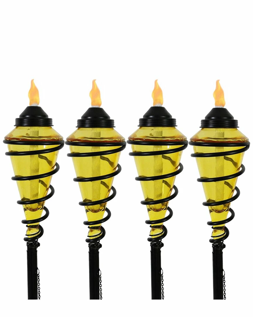 - This set of 4 torches features beautiful colored glass fuel containers that are attractively illuminated by torch light. Plus, this set of torches includes 4 fiberglass wicks that burn longer than regular wicks. The fuel containers may be filled with citronella, torch or bio ethanol fuel (please note, this set of torches does not come with fuel and must be purchased separately). To keep pesky mosquitoes away, fill the glass vessels with citronella to keep those unwanted guests from crashing any backyard party or personal outdoor relaxation time. Safely extinguish the flame on each torch with the included snuffers, which are conveniently attached to each torch by a chain. The set also includes ground stakes and deck clamps, providing the option to use them in the yard or on the deck rails.
