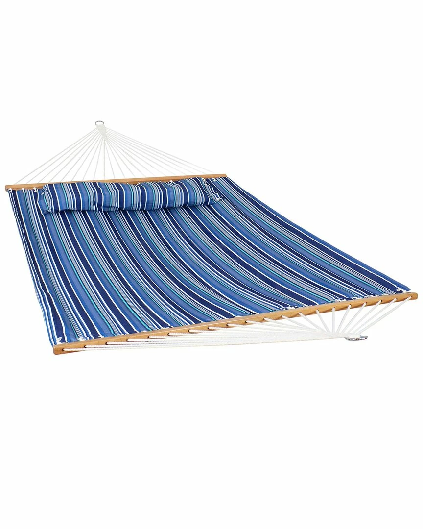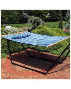 - Create the perfect place to relax with the extra comfortable Sunnydaze 2-Person Quilted Printed Fabric Spreader Bar Hammock and Pillow. This cozy large hammock is made of soft quilted cotton fabric and features a colorful and vibrant print. It’s the perfect addition for the patio, backyard, deck, or camp site. This backyard hammock can be easily hung from two trees or posts that are 11 to 15 feet apart. No trees? No problem! With a Sunnydaze 12′ or 15′ hammock stand (not included), this fabric hammock can be used anywhere.