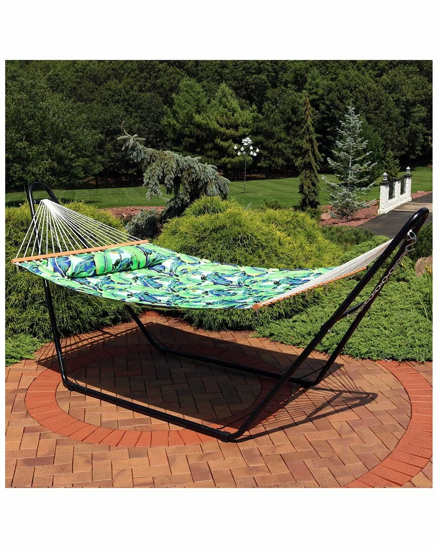 - Create the perfect place to relax with the extra comfortable Sunnydaze 2-Person Quilted Printed Fabric Spreader Bar Hammock and Pillow. This cozy large hammock is made of soft quilted cotton fabric and features a colorful and vibrant print. It’s the perfect addition for the patio, backyard, deck, or camp site. This backyard hammock can be easily hung from two trees or posts that are 11 to 15 feet apart. No trees? No problem! With a Sunnydaze 12′ or 15′ hammock stand (not included), this fabric hammock can be used anywhere.
