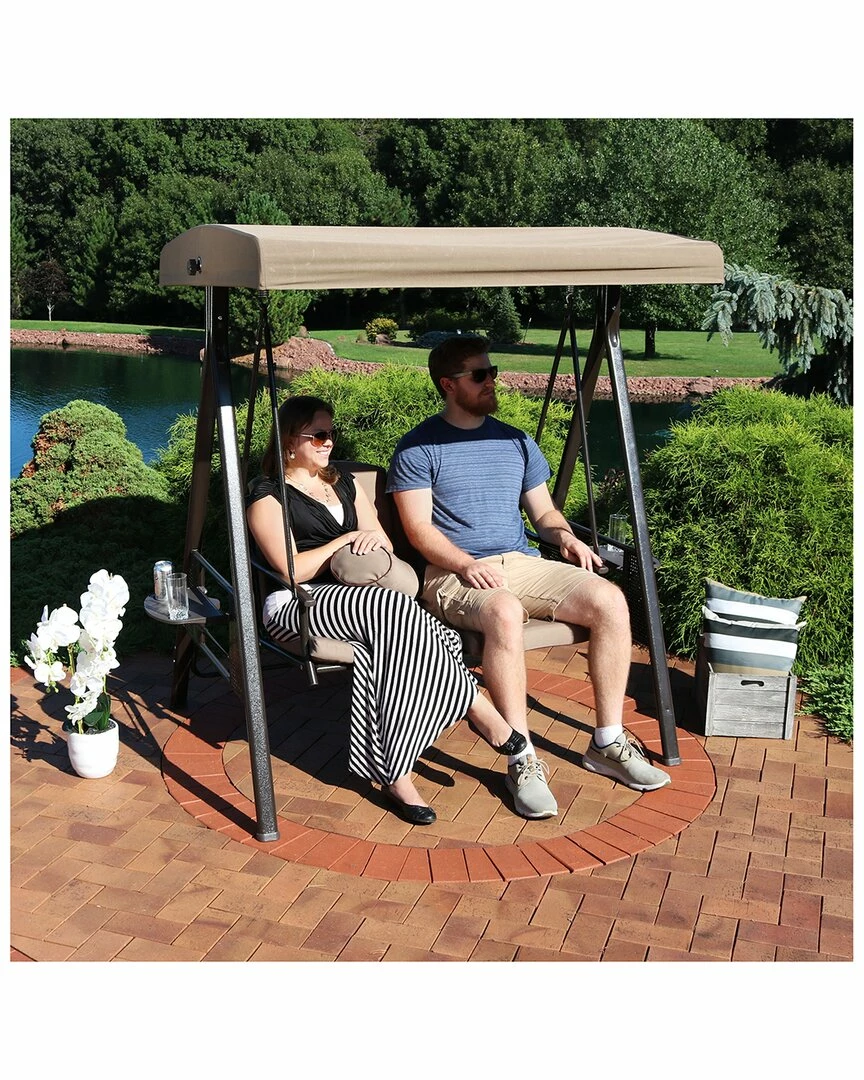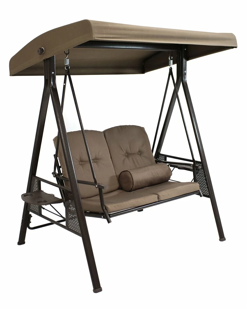 - Stay comfortable and cool in the backyard with this outdoor 2-person canopy patio swing. Both of the side tables are made of a sturdy plastic and easily fold down when not in use. The powder-coated steel frame is in an attractive brown color that perfectly complements the beige hue of the canopy, pillow and seat cushions. A great feature of this swing is the adjustable tilting canopy. Once the canopy is at the perfect angle, lock it in place by tightening the knobs on both sides of the canopy. Additional dimensions: seat is 39″ wide x 20″ deep x 17″ tall from the ground without cushion; 19″ tall from the ground with cushion. seat back is 39″ wide x 21″ tall without cushion; 19″ tall with cushion. Swing is 43″ wide x 37″ deep. Each of the seat arms are 1. 5″ wide x 27″ deep x 25. 5″ tall. The seat cushions are 39″ wide x 20″ deep x 2″ thick. The included pillow is 7″ diameter x 18. 5″ wide. Each of the side tables are 8. 25″ wide x 12. 5″ deep.