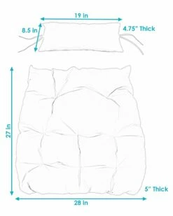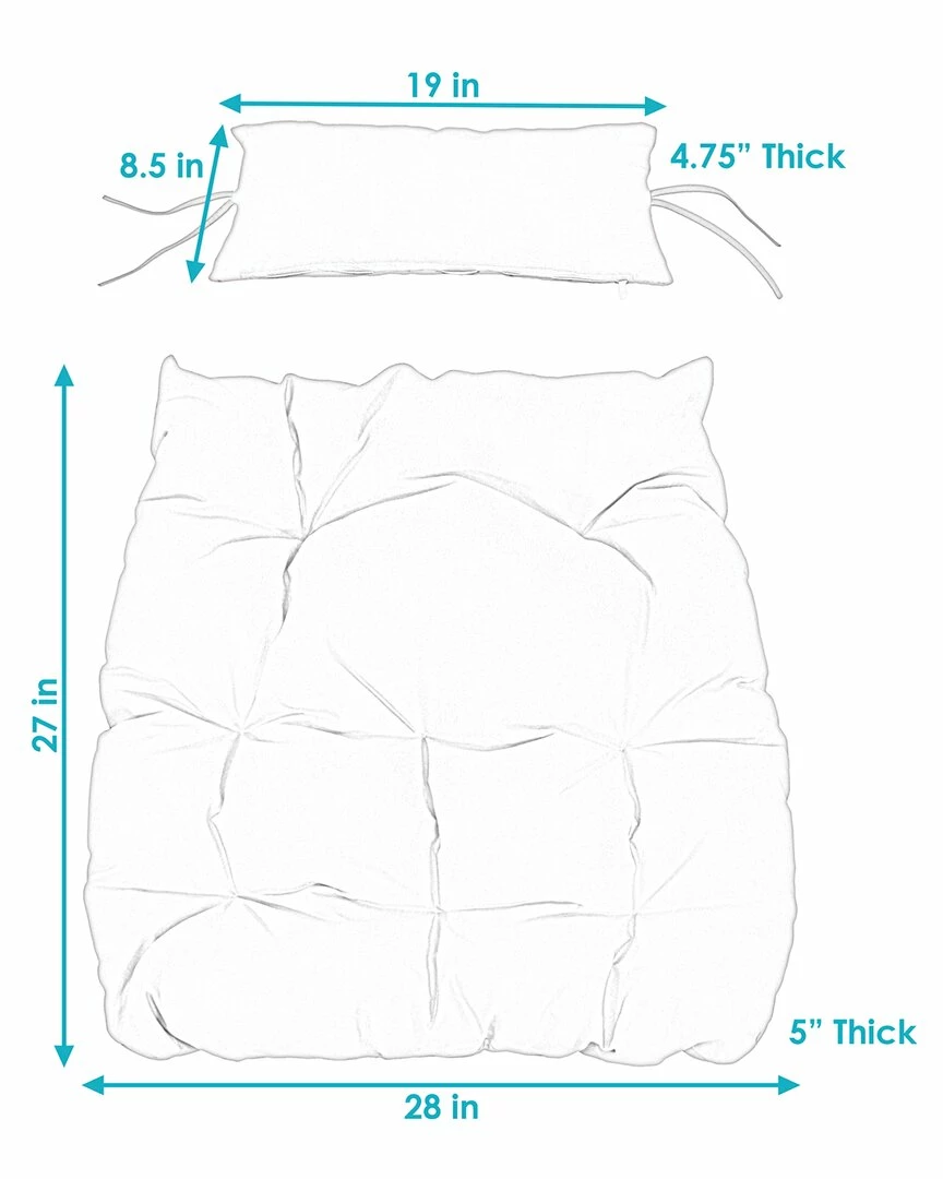 - MAKE YOUR SEAT COZIER: Headrest pillow is 8.5″ D x 19″ W x 4.75″ thick; Weighs 0.6 lbs.; Seat cushion is 27″ D x 28″ W x 5″ thick; Weighs 4.2 lbs.; Provides a soft place to sink into on your hanging basket chair; Classic colors and style work well with di