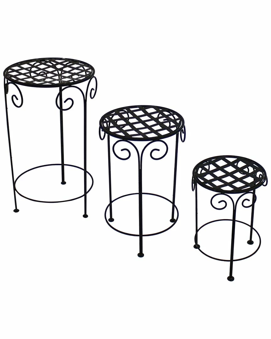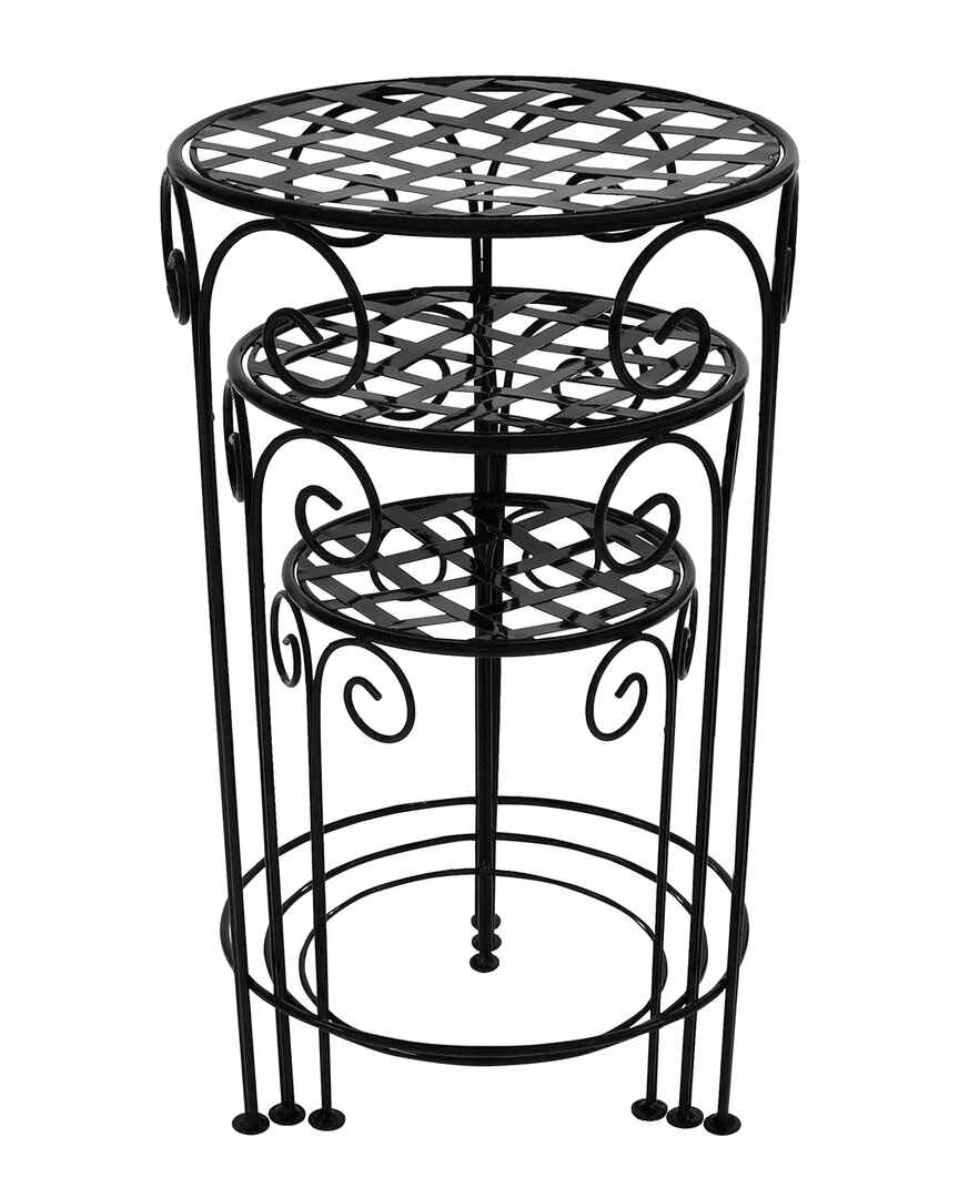 - Make flowers, ferns and other plants part of the decor with this set of plant stands. Perfect indoors or outdoors, these plant stands are constructed of strong iron with a timeless black powder-coated finish. These plant stands feature a classic scroll design that will add a decorative touch. This set of three plant stands includes 1 large, 1 medium and 1 small plant stand to create a cohesive staggered look with plants. Not only can these be used to hold plants, but they can also be used as a side table to hold books or magazines.