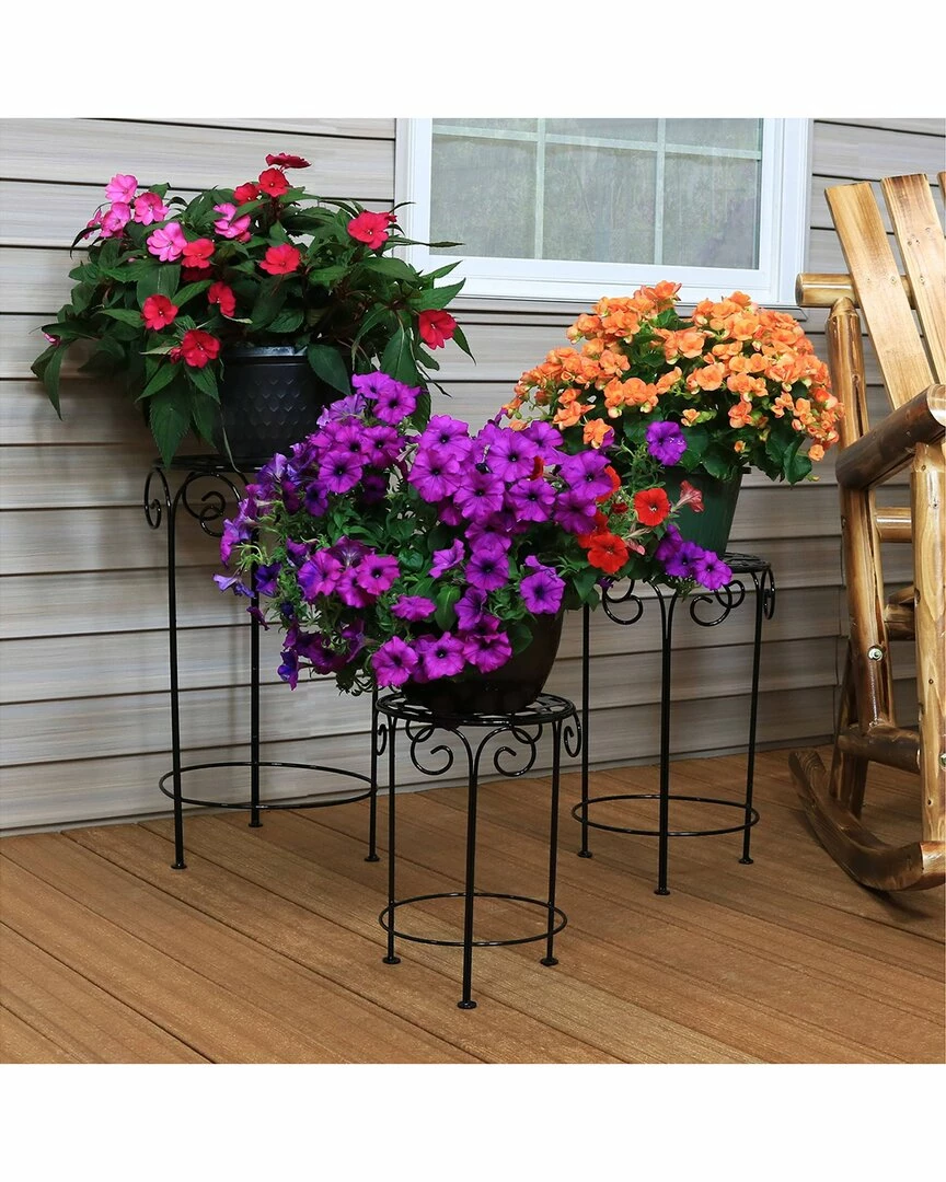 - DESIGNED FOR BEAUTIFUL DURABILITY: Each plant stand is constructed of strong iron with a timeless black powder-coated finish for stylish appeal; Stands also feature an elegant and traditional scroll design; Easily create a container garden