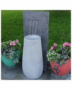 - With its sleek, modern design and waterfall-like sounds this outdoor fountain is sure to create a relaxing ambiance for the patio, yard, or garden. This stunning outdoor fountain features three separate streams of cascading water that fall from the top, into the white oval bowl below, where it recirculates back to the top. The LED light located in the oval bowl will keep this decor piece illuminated all through the night, giving any outdoor space a peaceful flow. This fountain is easy to use, once assembled and filled, simply plug it into a standard electrical outlet when its ready to run.