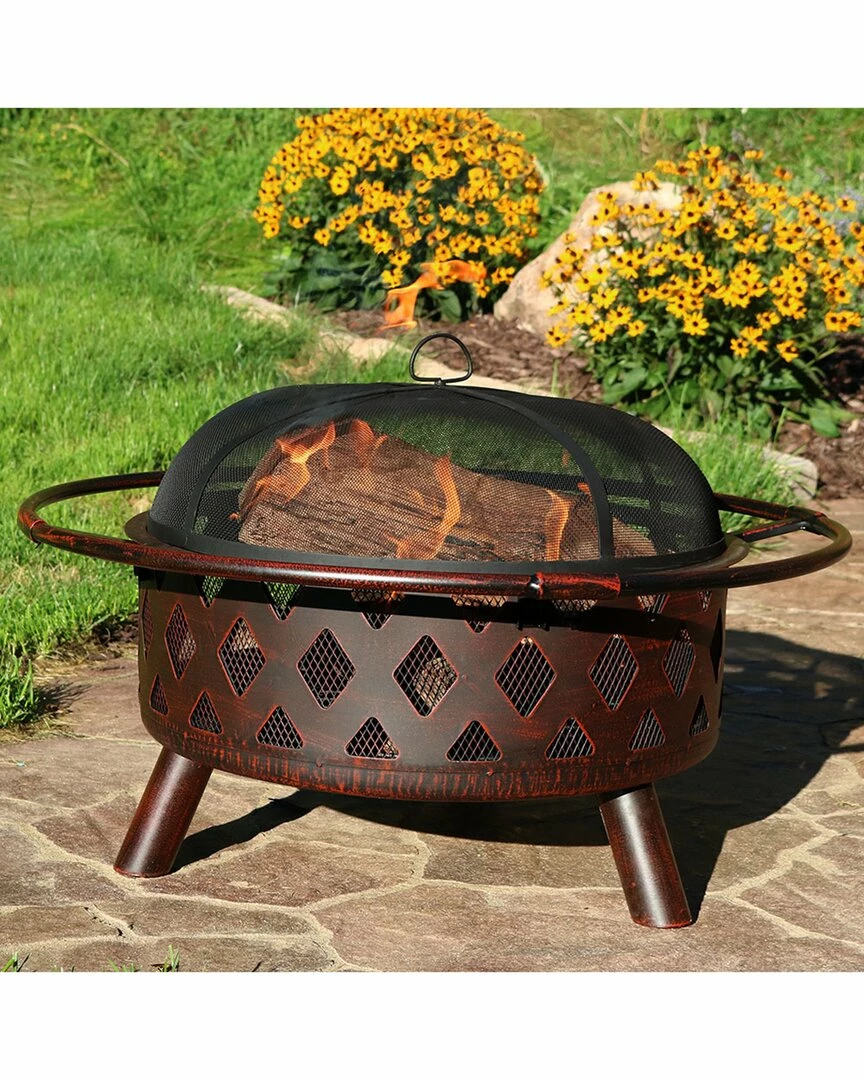 - This outdoor fire pit will add charm and elegance to any patio, deck or backyard. Elegant in style, and functional in design, the Bronze Crossweave firepit is sure to please on all levels. Relax around the bonfire while enjoying the warmth without worries about sparks flying out when by using the included spark screen, the 30″ firebowl is the perfect size for any fire and and has a convenient wood grate at the bottom of the bowl for firewood sit atop.