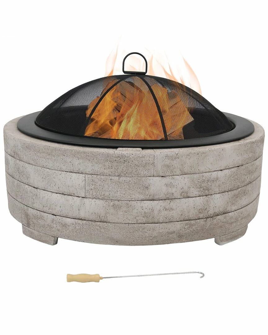 - Add this wood-burning fire pit ring to any backyard and enjoy the comfort it brings. Made of fiberglass-reinforced concrete, the base replicates the polished look of a stone fire ring, minus the work. It is designed to perfectly frame the steel fire bowl that is placed inside the base. Keep stray ashes and embers at bay by placing the steel spark screen on top of the fire bowl. This product has everything that needed to create a polished-looking fire pit ring, but with the convenience of not having to build it. Plus, the handles on the sides of the base make it easier and more convenient to move the fire pit around.