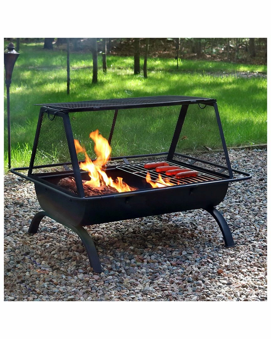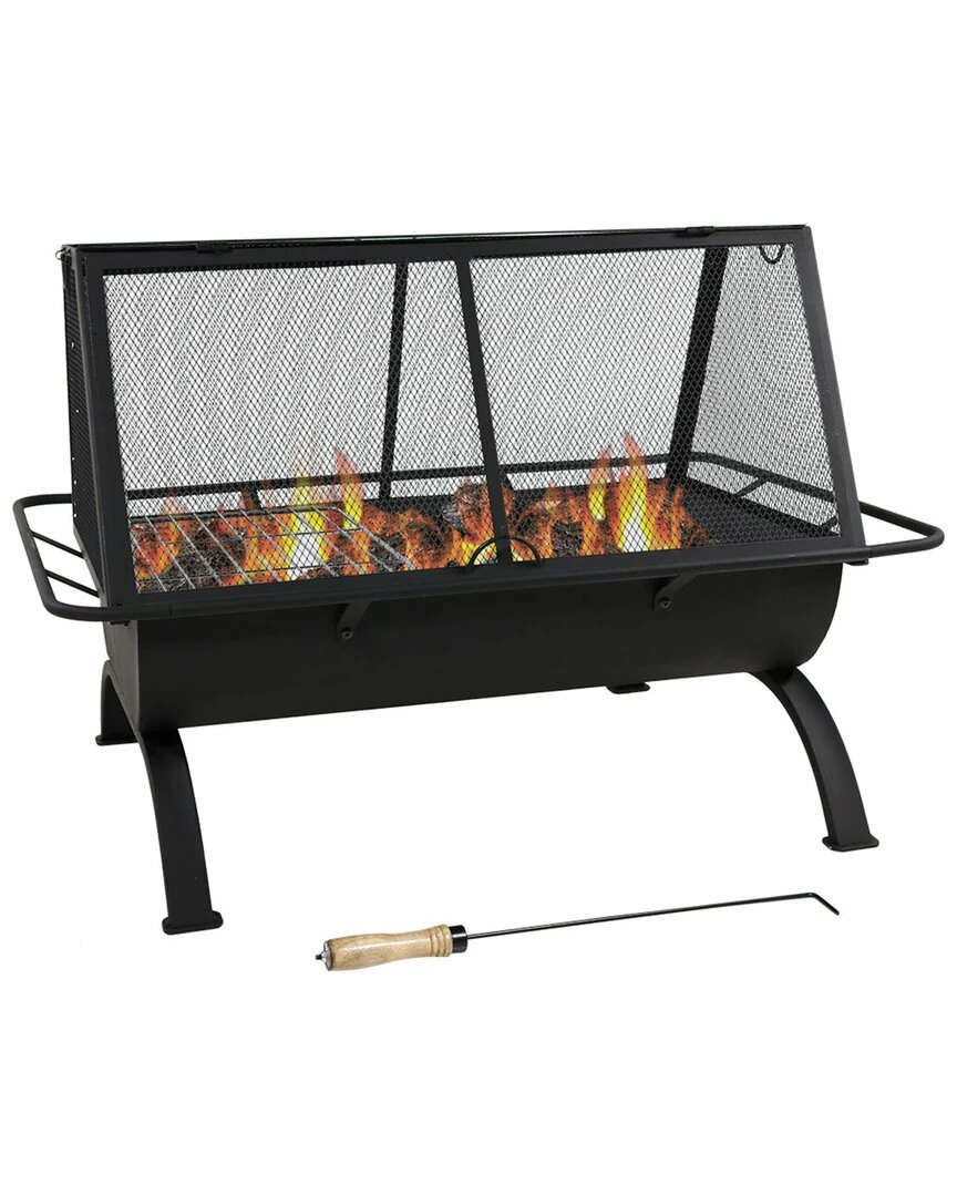 - This unique, rectangular “Northland Grill” outdoor fire pit — a caged wood- or charcoal-burning grill — with a trapezoidal metal mesh topper is among our best sellers. It incorporates a cooking grate that makes it ideal for BBQ areas on patios and in back yards. The appliance is formed of solid steel and durably finished in black for a contemporary look. A hinged access door in the side of the mesh topper provides easy access to burning logs and the grilling surface, and a tubular metal rail encircles the brazier, making it easy to lift and move. An ideal outdoor fireplace for patios and yards, this unit comes with a grilling grate, a multi-purpose poker tool, and a durable fitted vinyl cover.