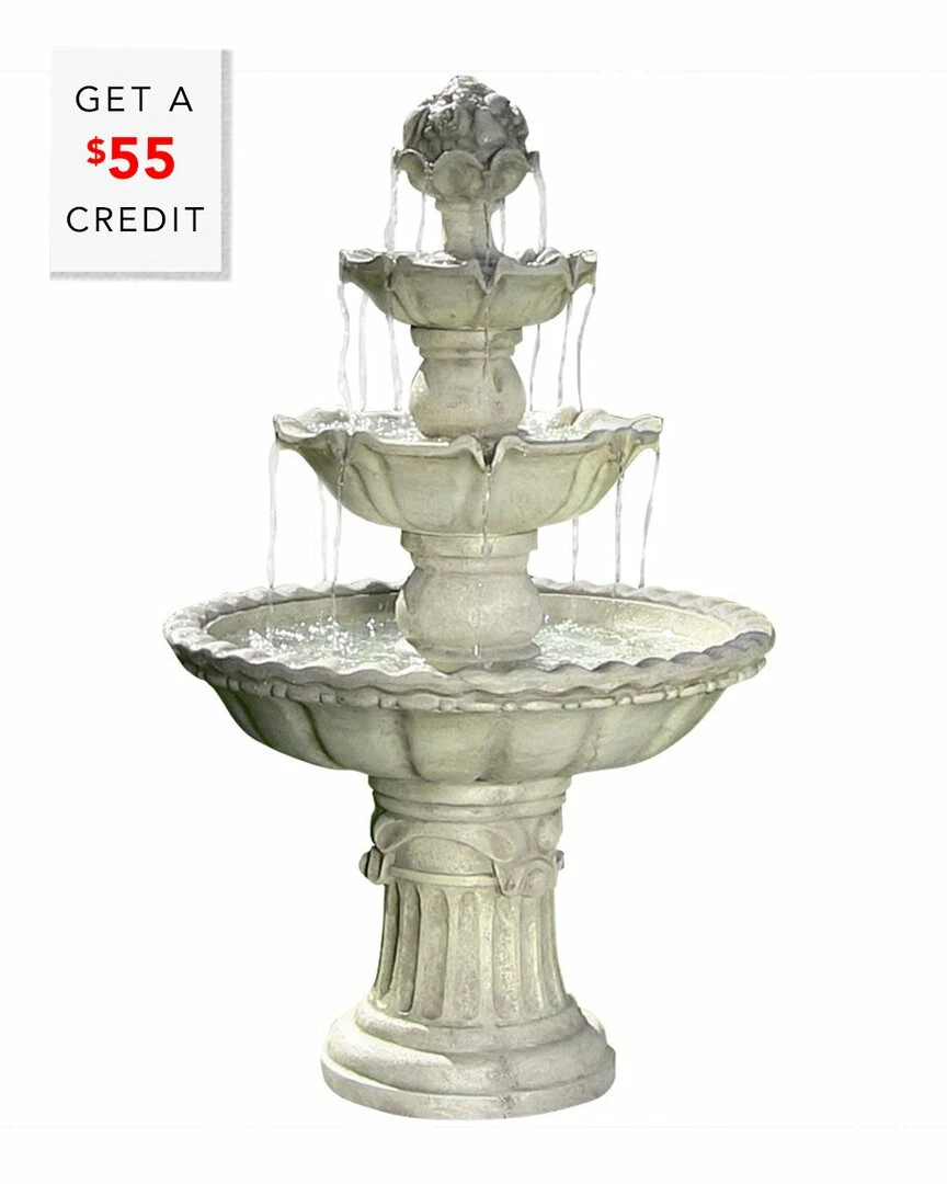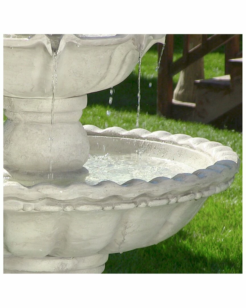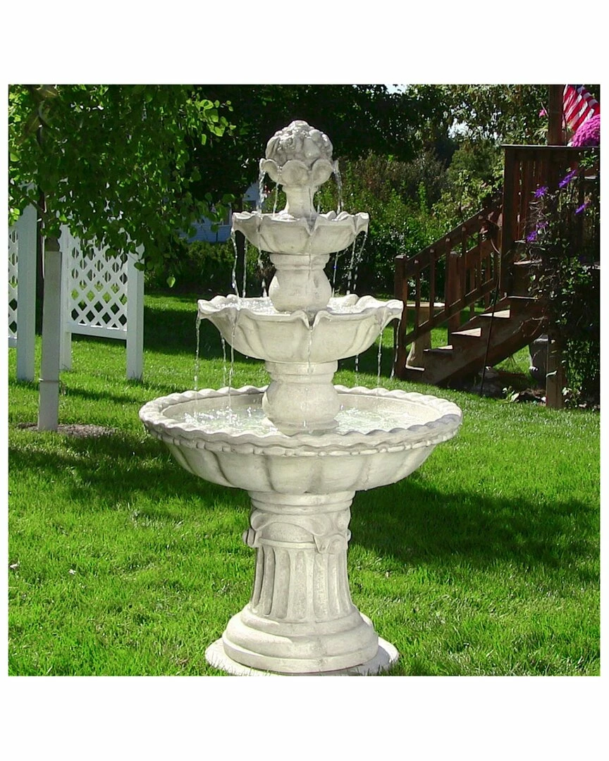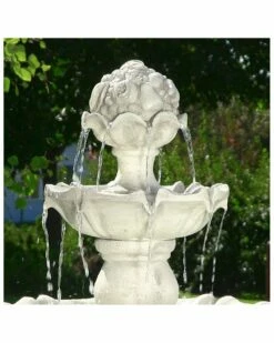 - This stunning outdoor fountain is made from a durable fiberglass material and it is the perfect focal piece that will add beauty to any deck, patio, or garden. Water flows out the fruit top and glides down each tier as the previous one fills, creating a soothing waterfall centerpiece. Once water reaches the basin, an electric recirculating pump brings it back to the top with no plumbing needed.