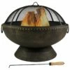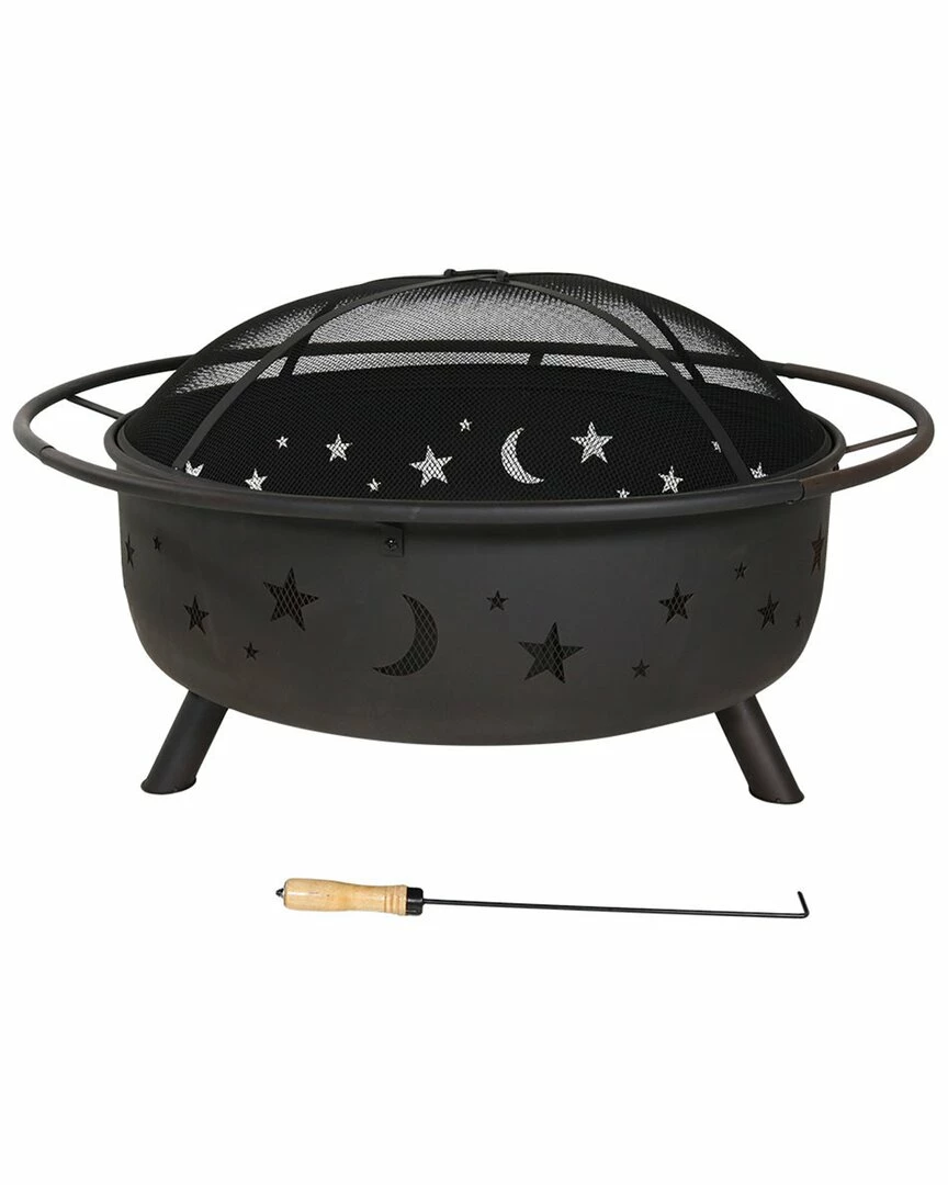 - This patio fire pit is not just an outdoor wood burning fire pit, it will also add a unique, artistic charm to any veranda, patio, backyard or cabin. Constructed of durable steel and enamel, die-cut stars and moons accent the large 42″ diameter fire pit bowl, which stands on three legs and is encircled by a tubular steel ring that makes moving the pit easy while providing a place to rest campfire tools. The aged/antique “rustic patina” high temperature paint finish matches current yard-decor trends. A protective, black metal mesh spark screen and poker are included accessories; grate strips cast into the body help provide airflow to burning logs. This extra large fire pit works as an outdoor fireplace or heater, and casts beautiful star-and-moon shadows on surrounding surfaces when used after dark. A customer favorite, it nicely matches cosmic and astrologically themed outdoor entertaining/garden areas, and is proudly made by Sunnydaze Decor.