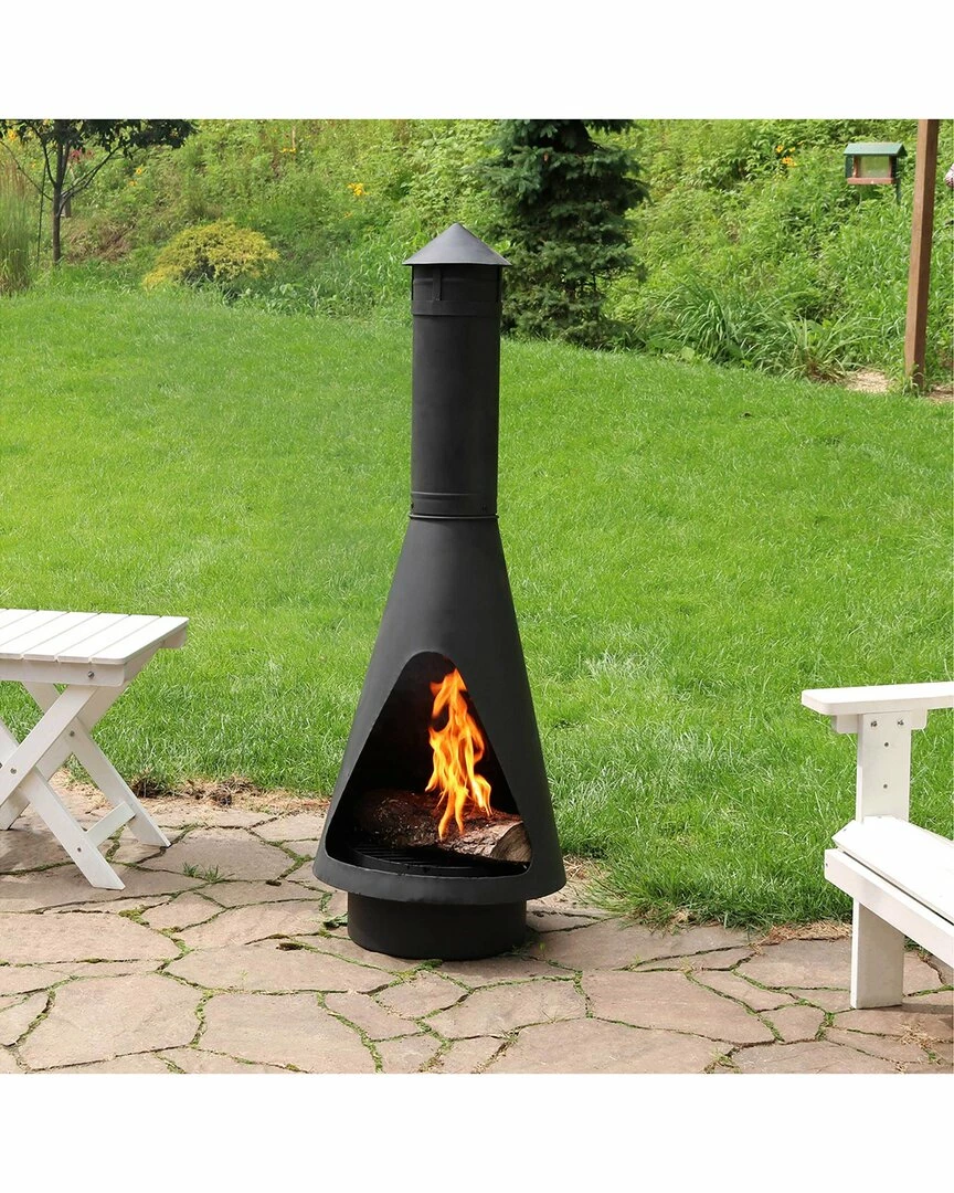 - HEAVY DUTY CONSTRUCTION: Chimnea is constructed of durable 0.6mm thick steel; Features black high-temperature paint that gives this outdoor firepit a sleek, modern look; Designed with a rain cap to protect the fire from rainwater; Perfect size to create a