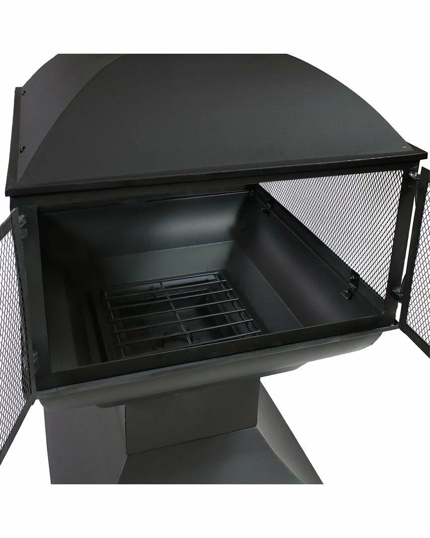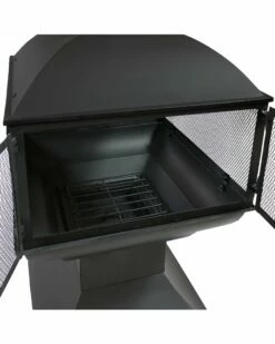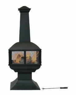 - Enjoy beautiful views at any angle around this steel chiminea fire pit. This outdoor fire pit is a great addition to any patio or backyard. Constructed of durable steel, the fire pit features a metal mesh enclosure around the fire to protect against stray embers and sparks, so you can relax and safely enjoy the fire. This fire pit also includes a log grate to promote optimal air flow for a better burning fire. It also includes a handy poker to help tend the fire safely.