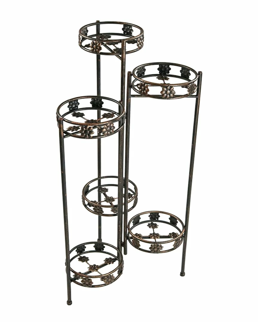 - Display plants in style on the deck, patio, or in the house with this lovely six-tier plant stand. Each plant stand features a sturdy metal design with a stylish bronze paint finish. Plus, this piece is foldable so storing it when not in use is a breeze.