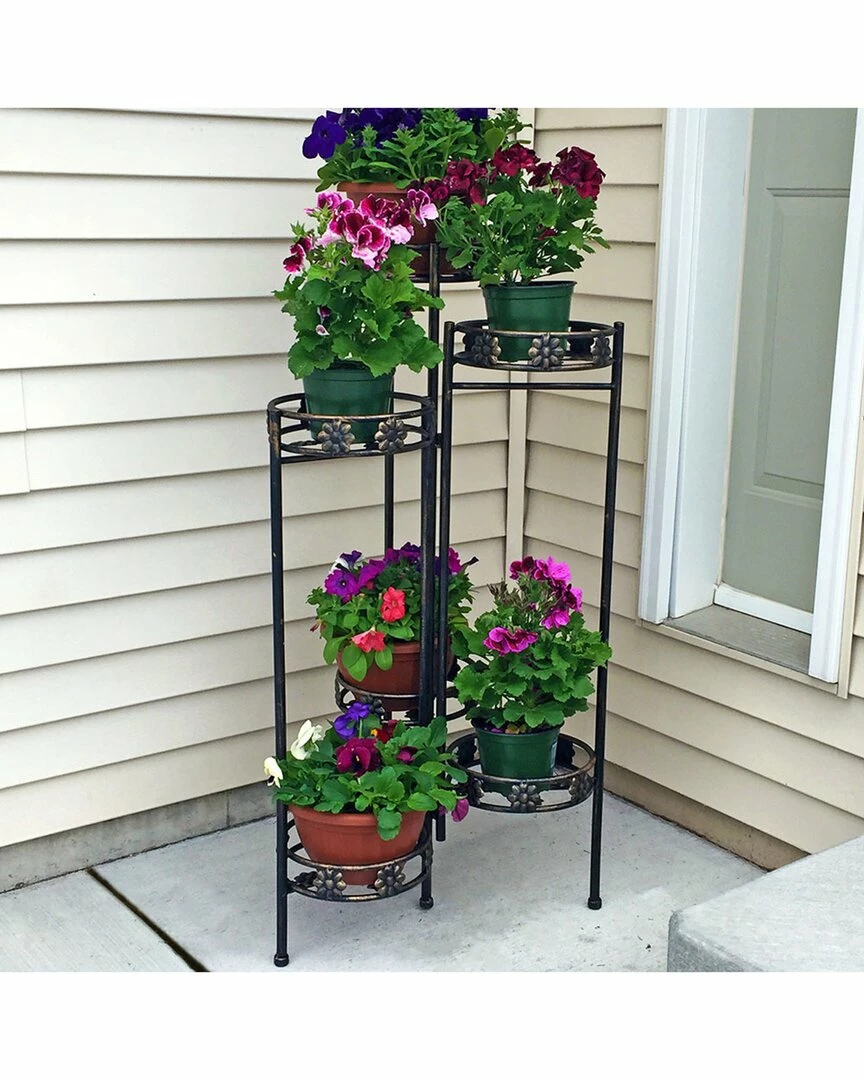 - RUST RESISTANT MATERIAL: Indoor plant stand allows for up to six flowers to be place in a staggered style; Material is resistant to rust when placed outdoors so it will maintain its beauty for years to come