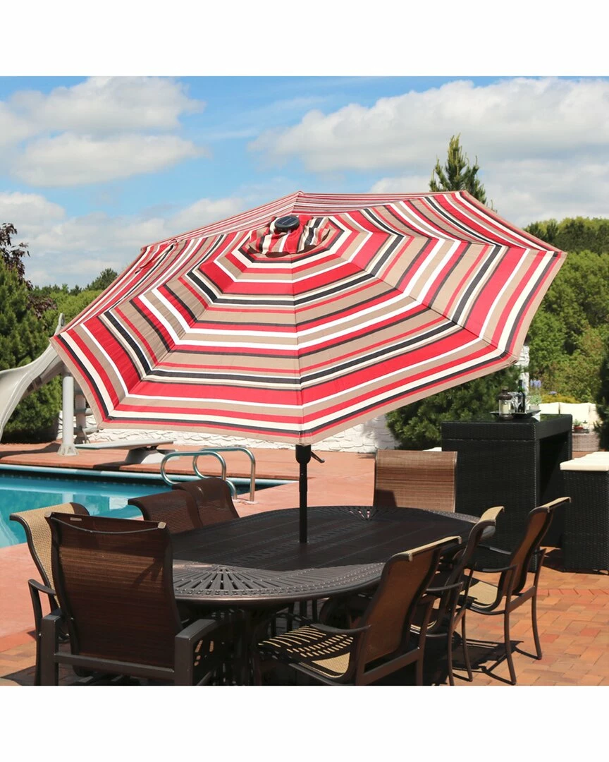 - This solar patio umbrella has everything needed to enjoy time outdoors and out of the sun. The tilt and crank functionality can conveniantly position the umbrella at the perfect angle, easily close and open it. The umbrella features a solar panel located at the top of the umbrella that powers the 24 LED lights located on the steel ribs making socializing or relaxing under the umbrella day or night much easier. Operate the light via a switch on the upper crank housing. When fully charged via solar power, the lights will last 8-10 hours! The large 9′ umbrella diameter makes it the perfect size for any 42″ – 54″ outdoor dining table and chairs. With a standard 1. 5″ opening base, use the umbrella with any favorite outdoor seat ing set! In addition, the umbrella is engineered to last with a black powder-coated aluminum pole for resistance to rust, steel ribs for maximum support and 100% polyester fabric for the umbrella for extra durability.