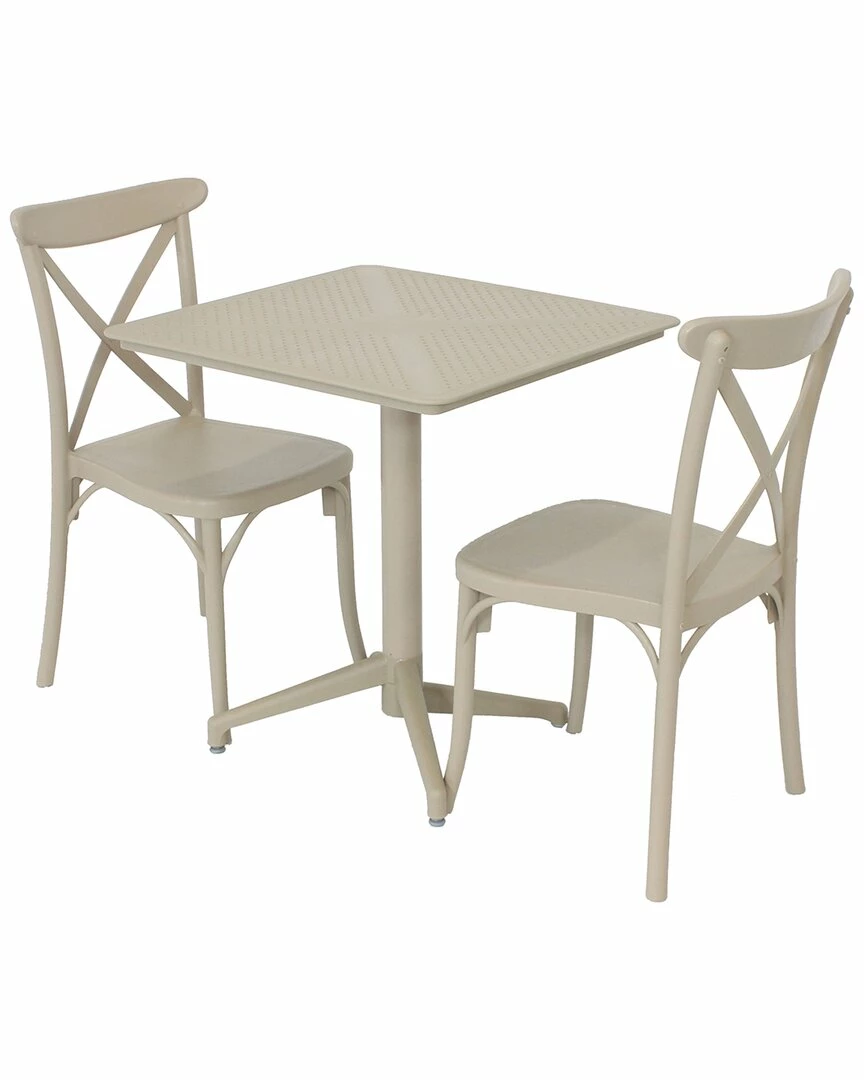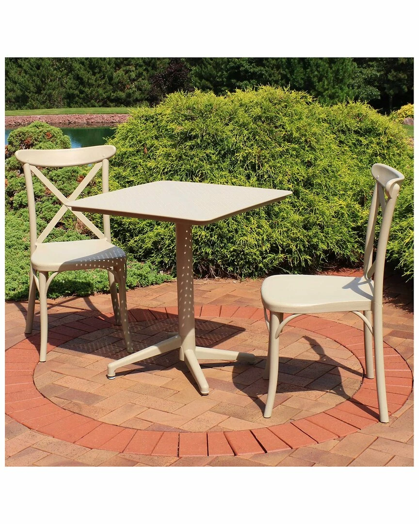 - Add contemporary charm to any outdoor or indoor space with the Bellemead dining set. The set includes 2 chairs and a square matching table. The chairs feature an appealing cross-back design while being ergonomically comfortable. The fiberglass-reinforced polypropylene construction ensures all-weather strength and durability. The minimalist-inspired table has a fold-down top for easy storage and is also designed to last with a resin top and base as well as aluminum feet.
