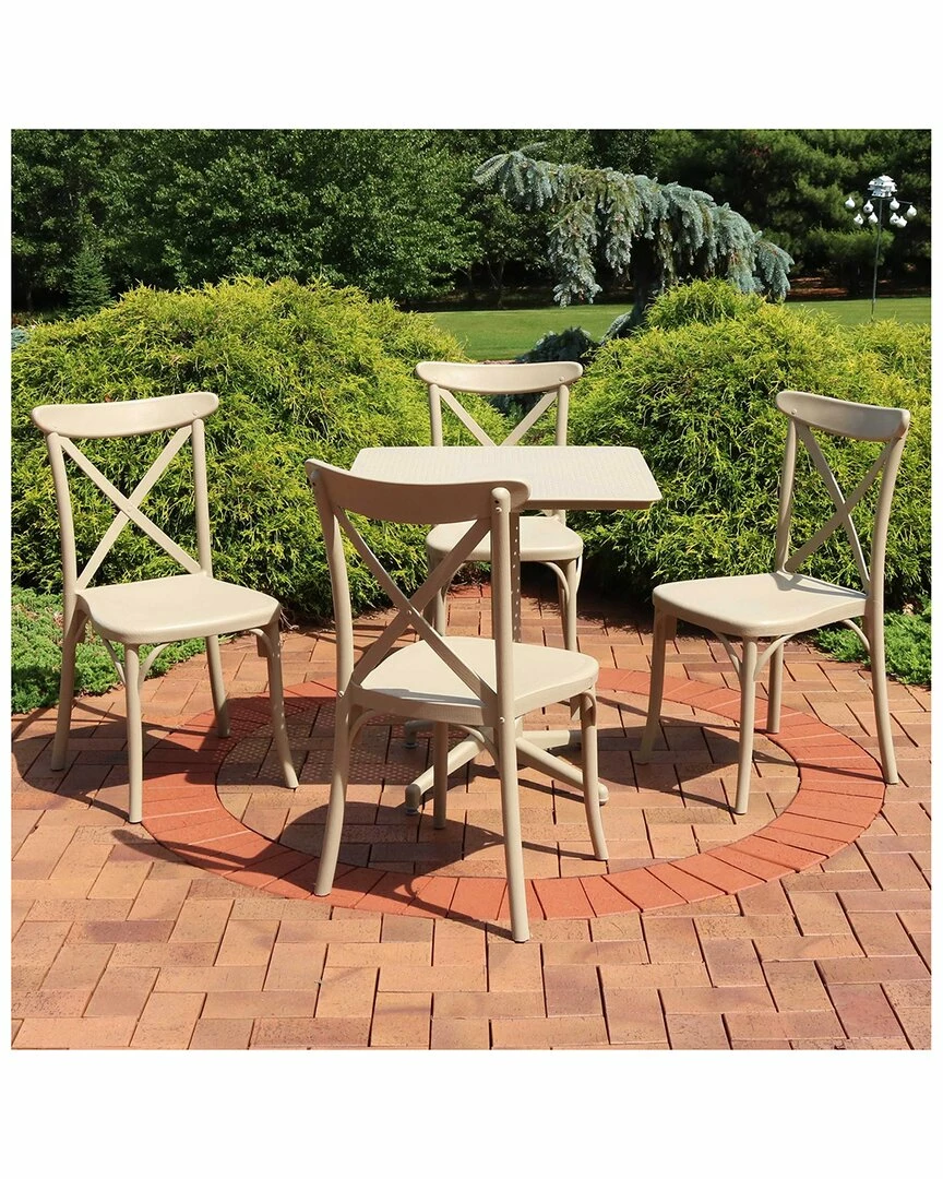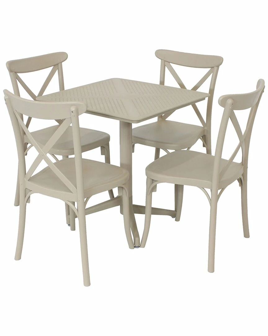 - Contemporary charm meets ergonomic comfort and all-weather strength with the Bellemead 5-piece indoor/outdoor dining set. The cross-back chairs feature ergonomic comfort and fiberglass-reinforced polypropylene construction for lasting strength and easy maintenance indoors or outdoors. The included resin square table is minimalist in design and the top folds down for easy storage.
