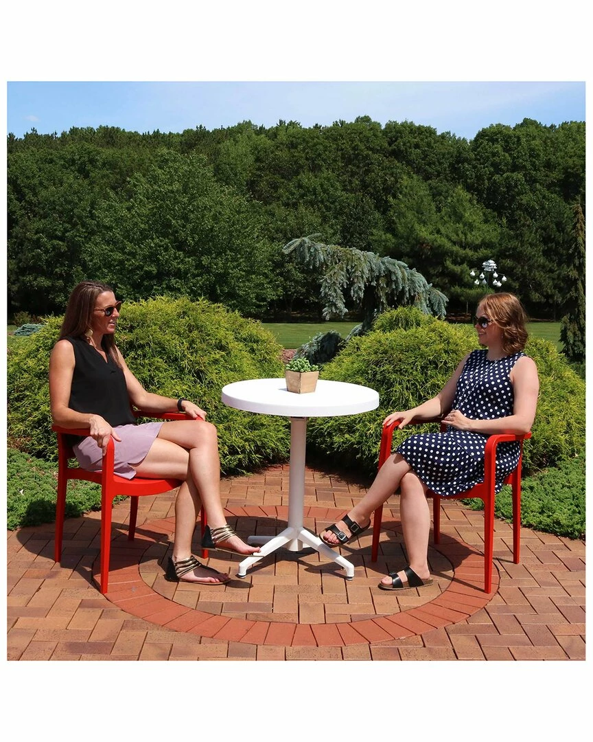 - This 5-piece all-weather dining set will add pops of color to the patio, deck or terrace with its vibrant chairs combined with the white table! The armchairs feature an ergonomically comfortable design combined with easy-to-maintain fiberglass-reinforced polypropylene composition. The white round table features a fold-down top and resin composition with aluminum feet.