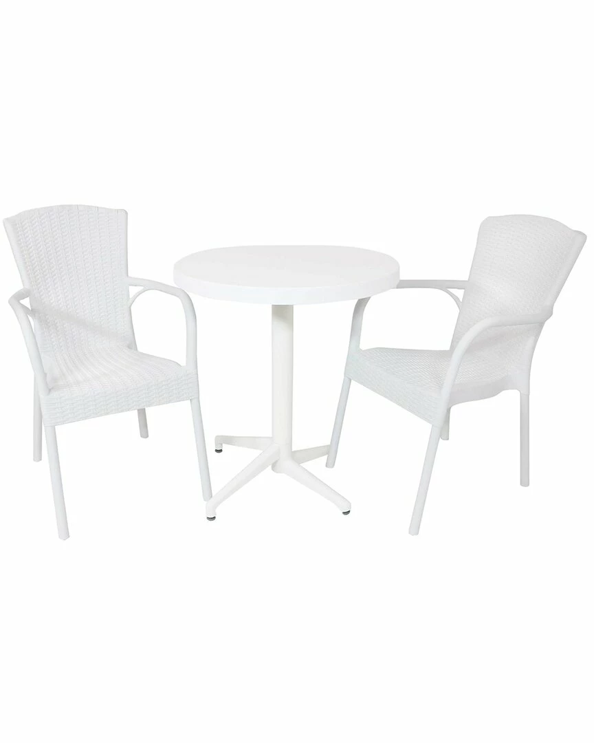 - The Segesta 3-piece indoor/outdoor dining set features classic design details and all-weather strength. The high-backed white armchairs feature a fiberglass-reinforced polypropylene construction as well as an ergonomic design for extra comfort. The included table is minimalist in design and features a resin top and frame with aluminum feet.