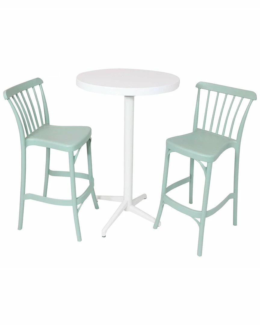 - ALL-WEATHER 3-PIECE SET: 2 barstools feature 100 percent virgin fiberglass reinforced polypropylene plastic construction while the bar-height table features resin construction with aluminum feet to make all pieces weather-resistant and easy to clean, main