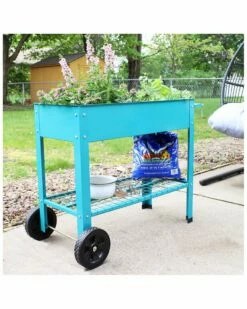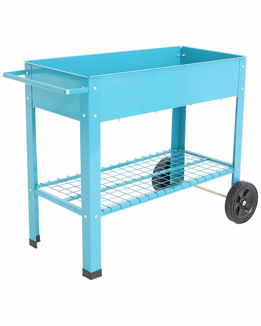 - Grow your favorite vegetables, plants, and flowers on your deck, patio, or yard with this raised garden bed cart with drainage holes. Bring your plants inside when it’s cold or move them into shade or sun as needed by pushing the cart with the convenient handlebar. The two wheels at the bottom of this cart make moving it a breeze. Plus, the built-in lower shelf is a convenient place to store gardening and plant supplies or potted plants. This garden cart is made from durable steel with a hot-dip galvanized blue finish for a bright pop of color in your garden, patio, or yard and resistance to rust and most weather conditions.