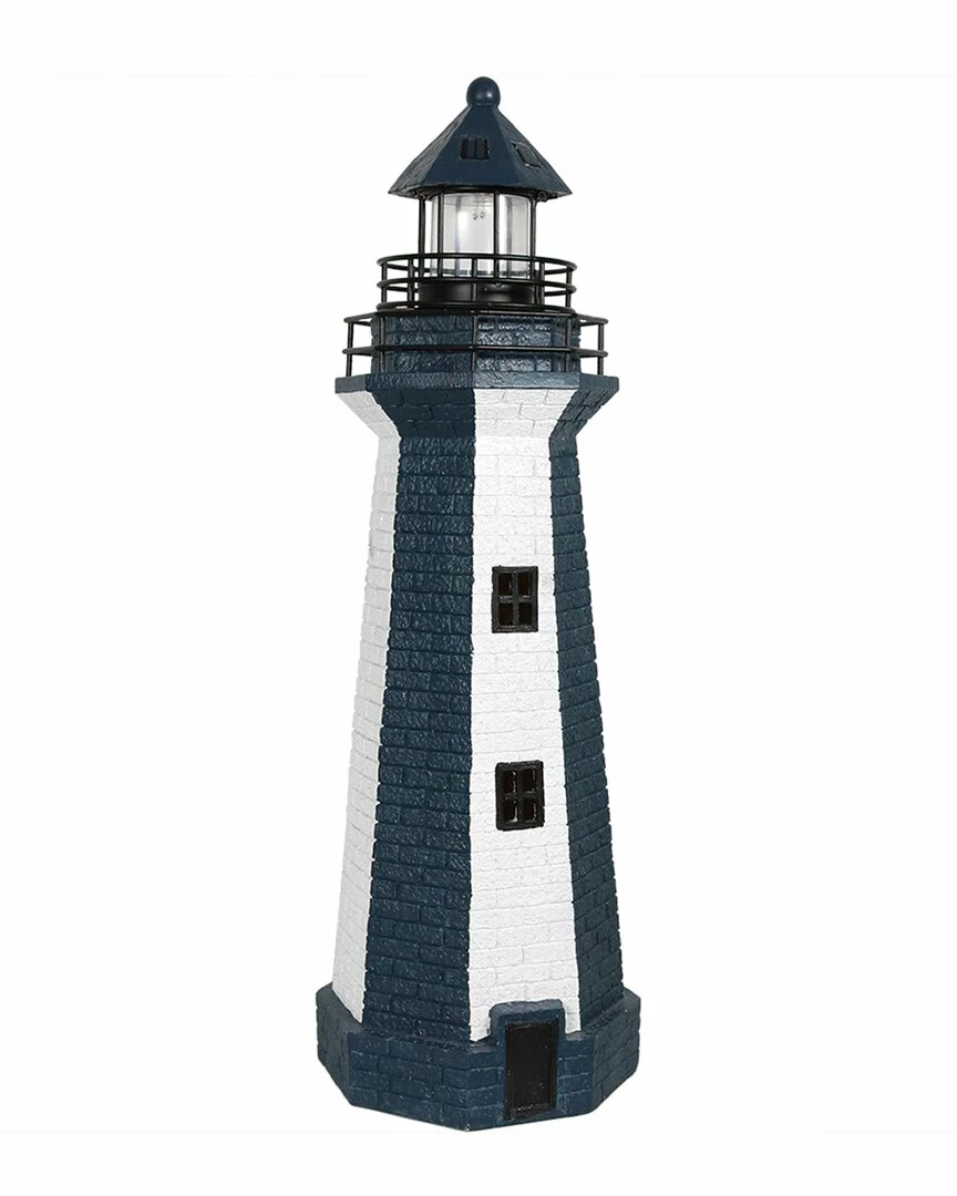 - This nautical-inspired outdoor solar LED lighthouse is sure to add charm to any backyard, patio or other outdoor space. Featuring a durable resin-metal construction, window and door detailing as well as push-button on/off switch, this piece is engineered to impress and last. The decorative lighthouse structure is designed to resemble a lighthouse one would find on the coast with its brick detailing and vibrant stripes. Place it anywhere it will collect direct sunlight during the day charging the batteries housed below the built-in solar panel and it will light up any landscape at night for up to 4-6 hours.