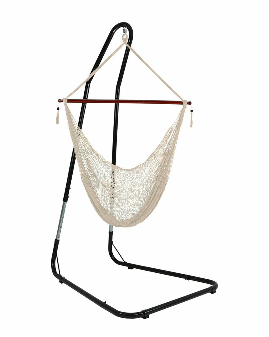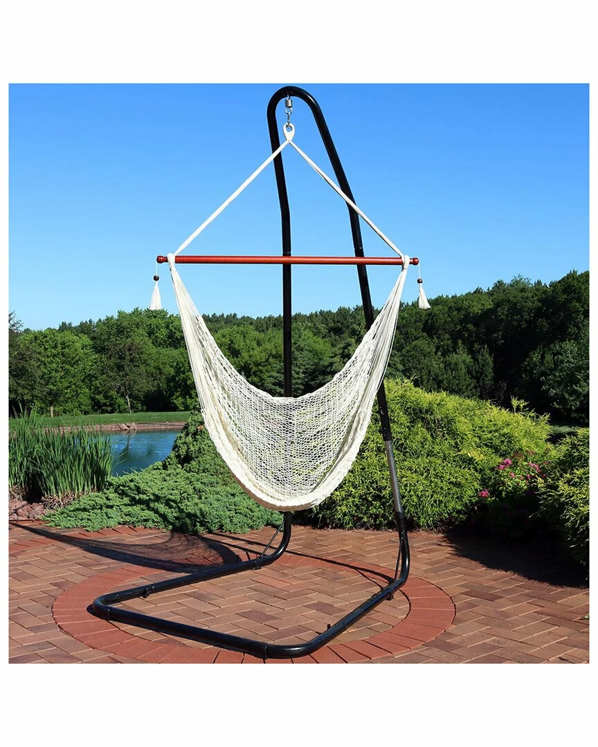 - For ultimate lounging, relax in the Sunnydaze Hanging Cabo Extra Large Hammock Chair. The net chair is made from breathable UV-resistant synthetic and soft string polypropylene, and it is available in several colors. The sturdy wood spreader bar keeps the sky chair open, making it easy to get in and out of. Hang this chair from the patio, porch, or use it with the included hammock chair stand to make it easily portable. With the hanging tassels on each side of the hammock chair the stylish design will easily complement any outdoor space. The included hammock chair stand features a linear design that offers greater stability than that of a traditional C-stand because of the structural stability offered by the arch shape and powder-coated tubular steel construction and the durable plastic stabilizing feet. The swinging chair stand is height-adjustable from 79″ to 93″ tall; making it easy to hang the hammock swing at a comfortable height.