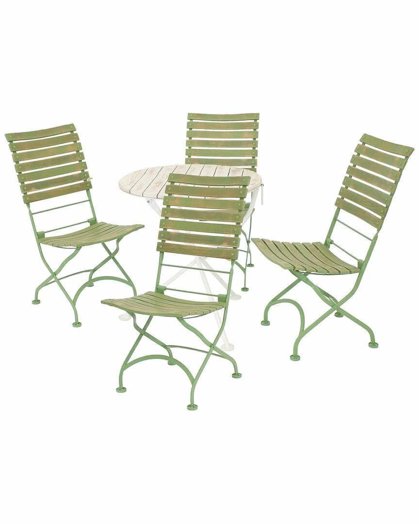 - Create a European-inspired atmosphere in your home or garden, or on the deck, patio or porch by using this table and chair bistro set. The shabby chic quirkiness of the colorful weathered painted chestnut slatted wood seat chairs paired with the whitewashed round wooden top folding bistro tables creates an instant charming accent. Each furniture piece folds up for easy storage and mobility. This versatile dining, card table set is designed to last as the chairs feature a 7mm thick powder-coated steel frame with an electrogalvanized undercoat and powder-coated top cot for extra protection against rust. The hand-finished weather-resistant chestnut slatted wood pieces are affixed to the chair frames via metal nuts and bolts. The table features a 21mm diameter, 2mm thick powder-coated steel pipe frame with zinc undercoating for long-lasting rust-resistance and strength. The table also has a chestnut slatted wood top with whitewashed finish. Plus, this set has many uses, keep it stored away inside the house for when family gathers on holidays or special occasions and more!