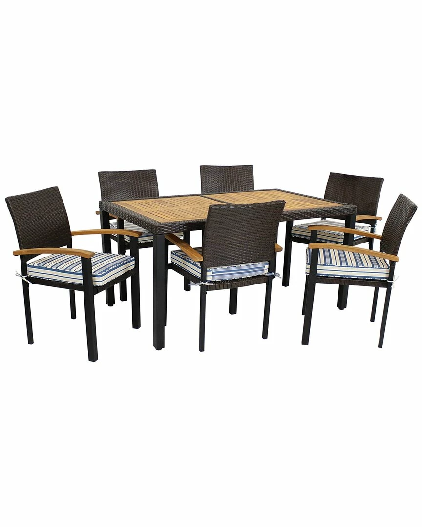 - Dine outside in the fresh air with the Carlow 7-Piece Outdoor Dining Patio Furniture Set from Sunnydaze Decor. This attractive outdoor furniture is durably constructed with a powder-coated steel frame wrapped in resin wicker. The table features beautiful acacia wood legs and tabletop for accents that add a natural touch. This 7-piece dining set includes 1 outdoor table and 6 chairs. Have a comfortable place to sit with the included seat cushions, which are also removable for easy care and maintenance.