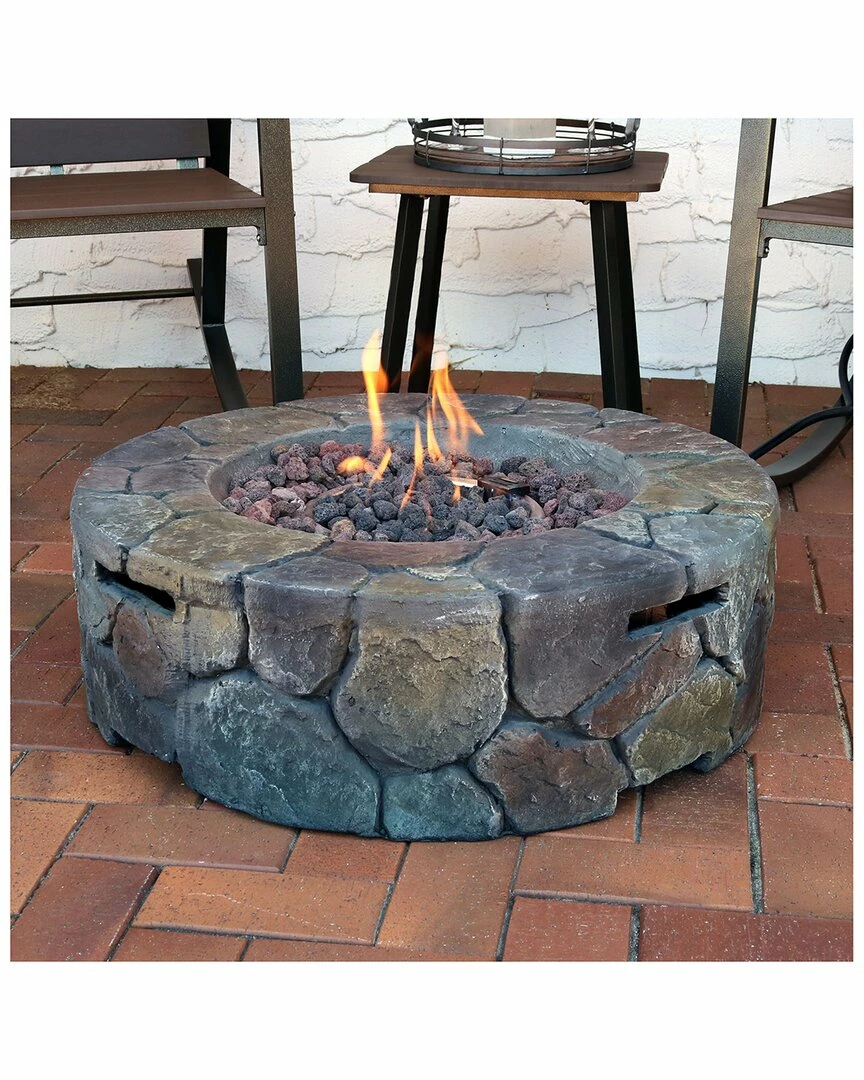 - This stunning LP-fueled gas fire pit will add instant charm to any home’s traditional outdoor space. The gas fire pit features a fiberglass-reinforced magnesia oxide cast stone construction made to look like natural stonework. The unit includes a 10″ diameter stainless steel burner, a battery for the ignition, a weather-resistant polyester cover, 6 lbs. of lava rock, and a 5′ gas hose with regulator. Please note, the fire pit is designed to have a 20-lb. LP tank sit outside of the fire pit. Please do not attempt to place the tank inside the base or underneath it. To use the fire pit once the propane tank is hooked up, push the flame control knob in a counter-clockwise rotation to low, and then push the igniter button until flame lights.