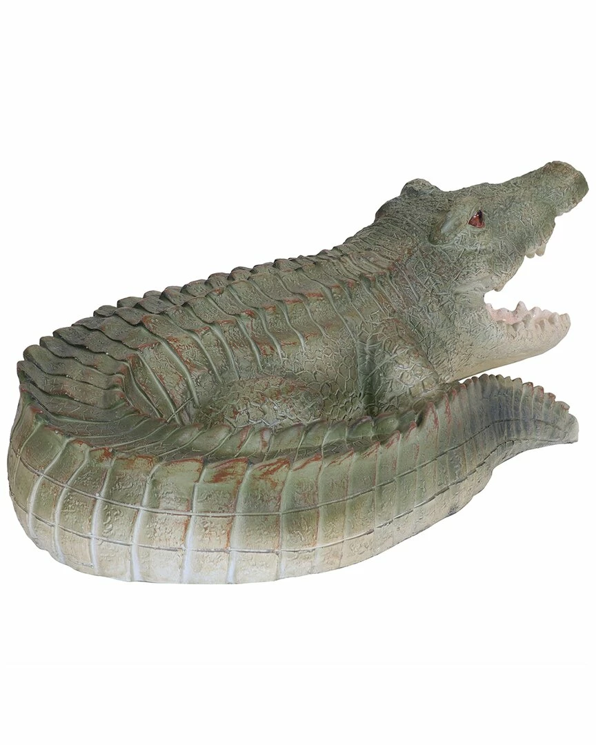 - This crocodile statue is a unique addition to any backyard, garden, poolside or lawn. The realistic reptile statue features a polystone construction and is painted to resemble a crocodile. The animal is posed with an open mouth ready to attack.