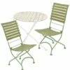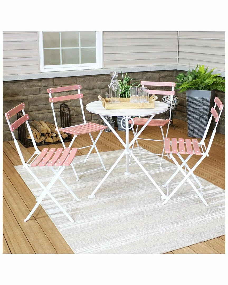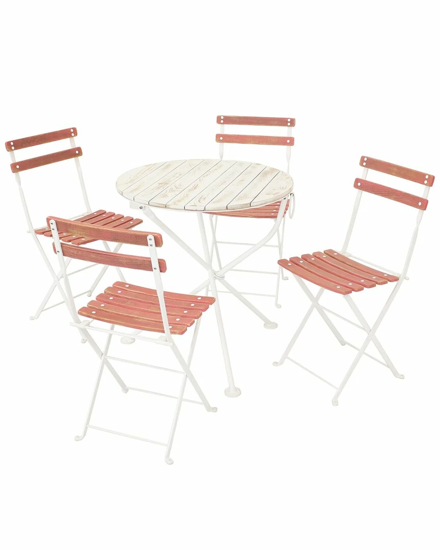 - Give your indoor or outdoor space a French Cafe style accent with this charming table and chair dining bistro set. The colorful weathered painted chestnut slatted wooden chairs paired with the whitewashed round wooden top folding bistro table creates an instant charming accent. Each furniture piece folds up for easy storage and mobility. Each piece is designed to last. Chairs feature a 7mm thick powder-coated steel frame with an electrogalvanized undercoat and powder-coated top cot for extra protection against rust. The hand-finished weather-resistant chestnut slatted wood pieces are affixed to the chair frames via metal nuts and bolts. The table features a 21mm diameter, 2mm thick powder-coated steel pipe frame with zinc undercoating for long-lasting rust-resistance and strength. The table also has a chestnut slatted wood top with whitewashed finish.