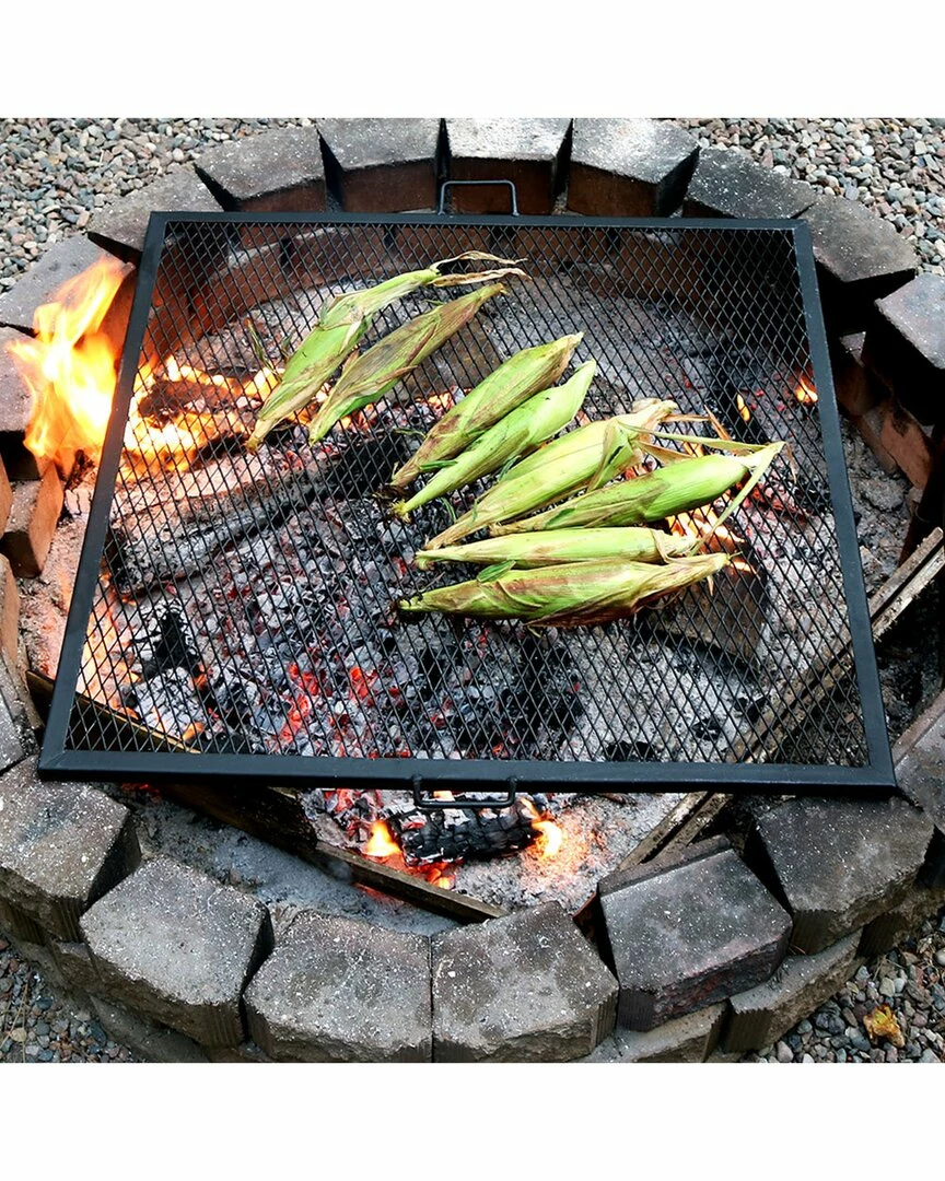 - This heavy-duty square mesh steel fire pit cooking grate and is perfect for camping and more. Cook all the campfire food the heart desires with this square fire pit cooking grill. The grill is square-shaped making it perfect for square fire pits, and it is made from durable Q235 steel material with a steel mesh surface to allow food to cook evenly. Plus, the handles on the sides and the raised edges makes it easy to maneuver and keeps food sliding off into the flames.