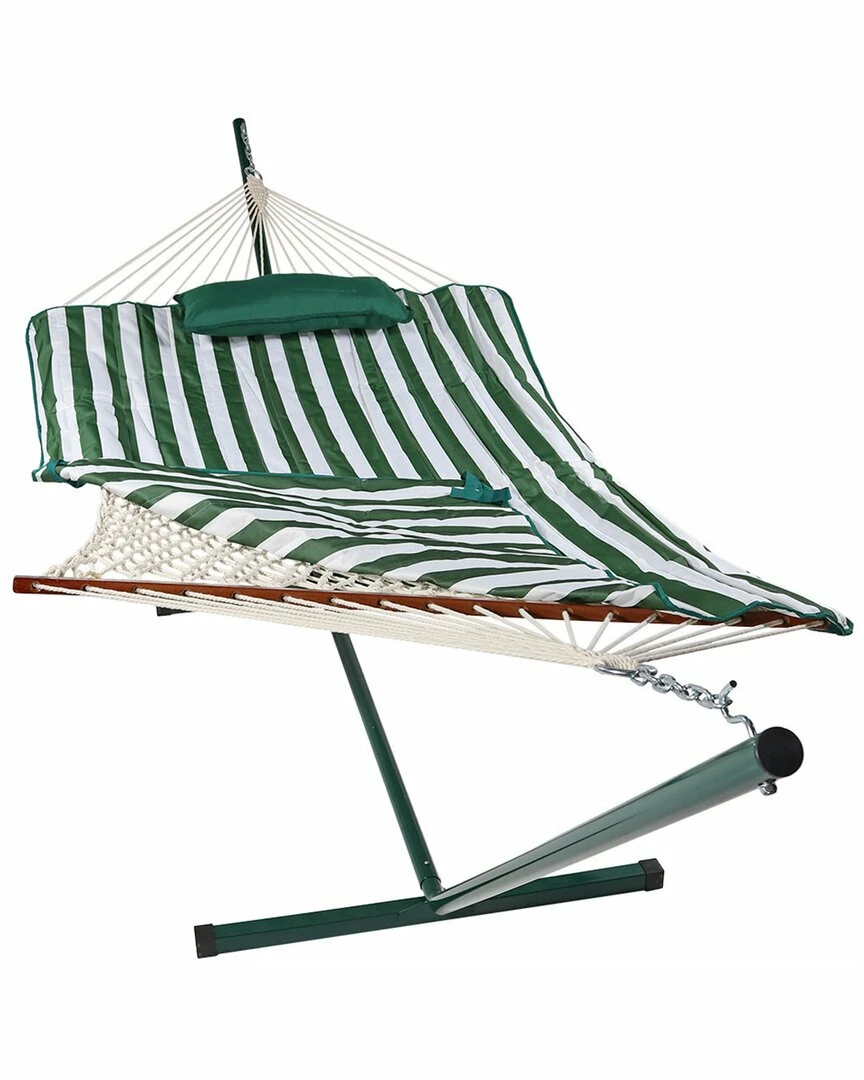 - Enjoy those lazy days outdoors with this attractive green striped hammock with stand combo. At the lake, on the patio or backyard this quilted rope hammock and stand combo with comfy cloth pad is the perfect 2-person hammock and comes with everything needed, plus, no tools are needed! The heavy-duty stand makes it sturdy, durable and portable making it easy to follow the sun or shade, and to take down in winter months.
