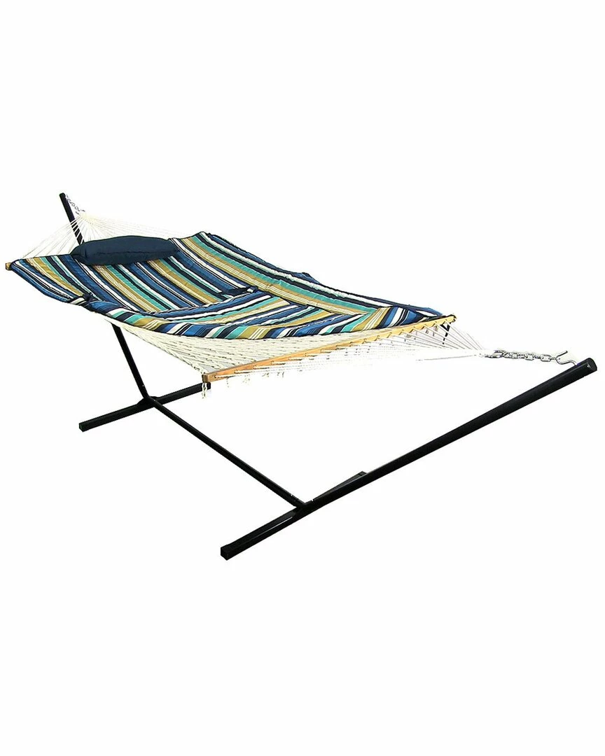 - Enjoy the lazy days of the warmer seasons with this hammock and stand set. At the lake, on the patio or in the yard, this portable outdoor hammock and stand combo comes with everything needed for assembly, plus, no tools needed! Included is the rope hammock with a weight capacity of 275 pounds, blue yellow and green striped hammock pad and pillow, a 12-Foot heavy-duty steel hammock stand and all the hardware needed for a complete, easy set up in just minutes.