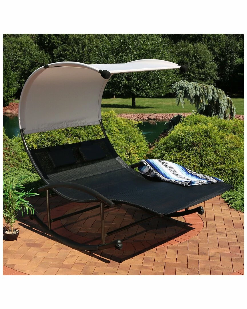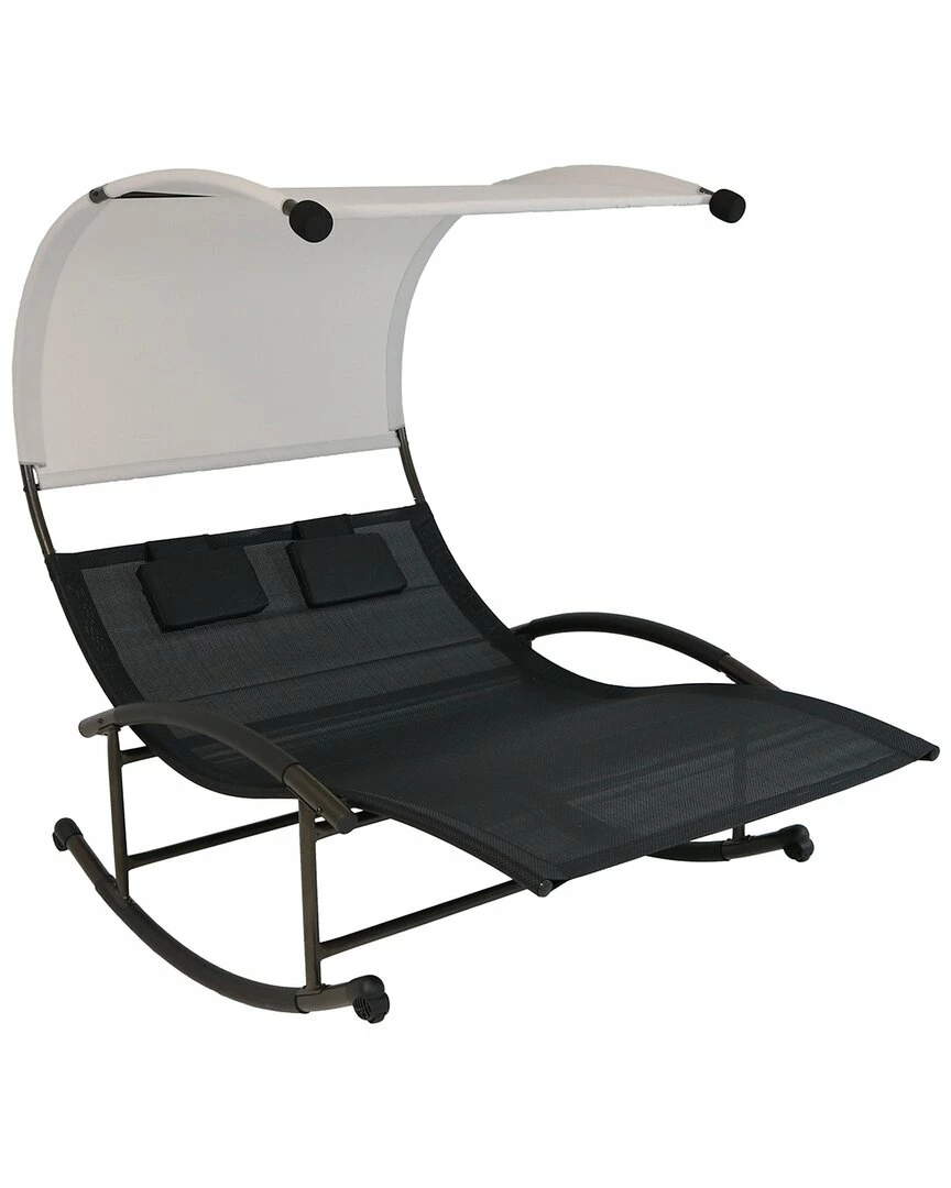 - Create a tropical yet modern oasis with the double rocking chaise lounge chair by Sunnydaze Decor. The 2-person rocking chair can hold up to 2 adults and features an easy-to-maintain sling seat and back material as well as a powder-coated steel frame for rust-resistance. Wheels on the frame also make the lounger easier to move. With the modern design relax the day away with a good book, nap or a loved one. The lounger comes complete with 2 headrest pillows and a canopy to rest and relax in the shade.