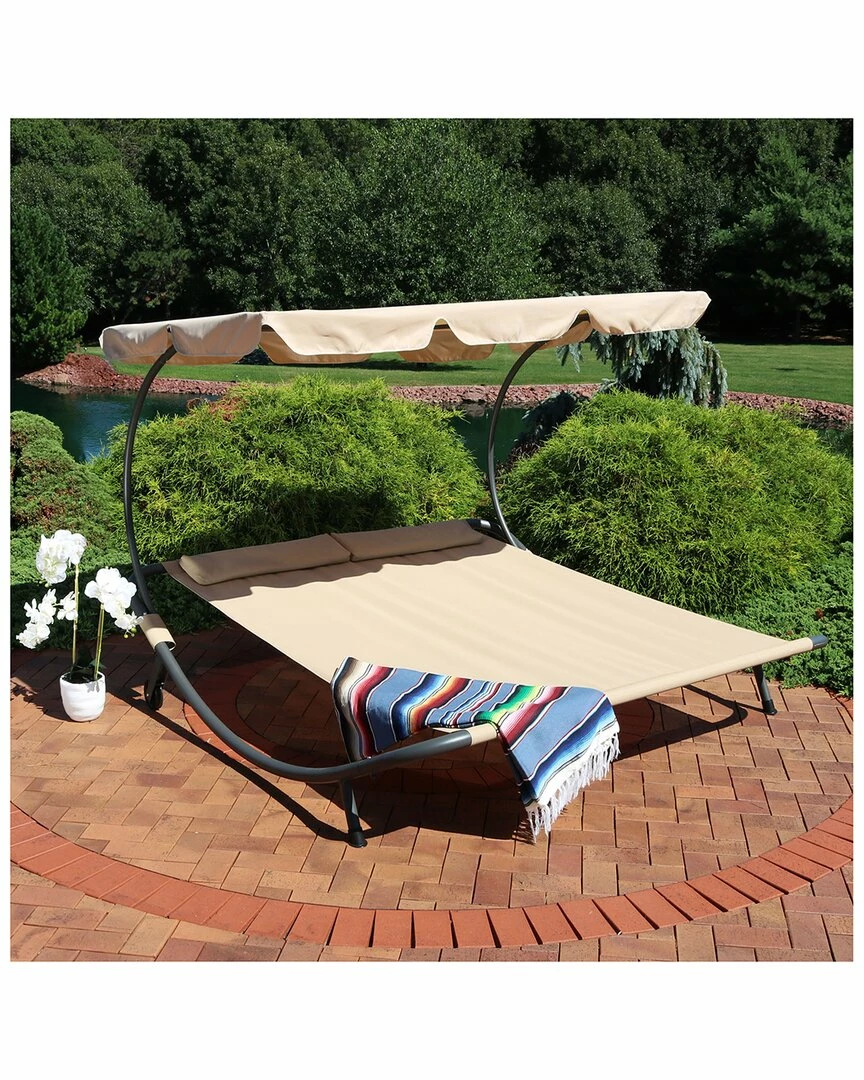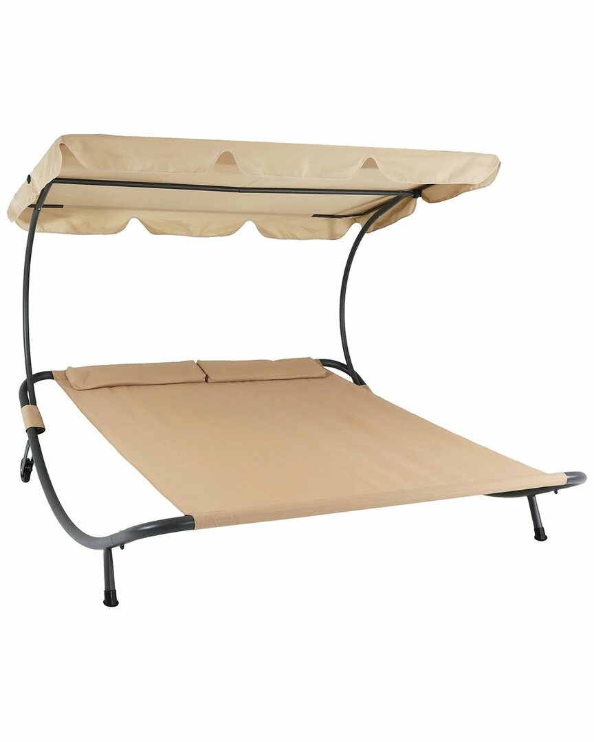 - Take a vacation in the cabana-inspired outdoor double bed with canopy by Sunnydaze Decor. The 2-person bed can hold up to 2 adults and features an easy-to-maintain sling seat and back material as well as a powder-coated steel frame for use resistance. With the modern design, relax the day away with a good book, nap or a loved one. The lounger comes complete with 2 headrest pillows and a canopy to rest and relax in the shade.