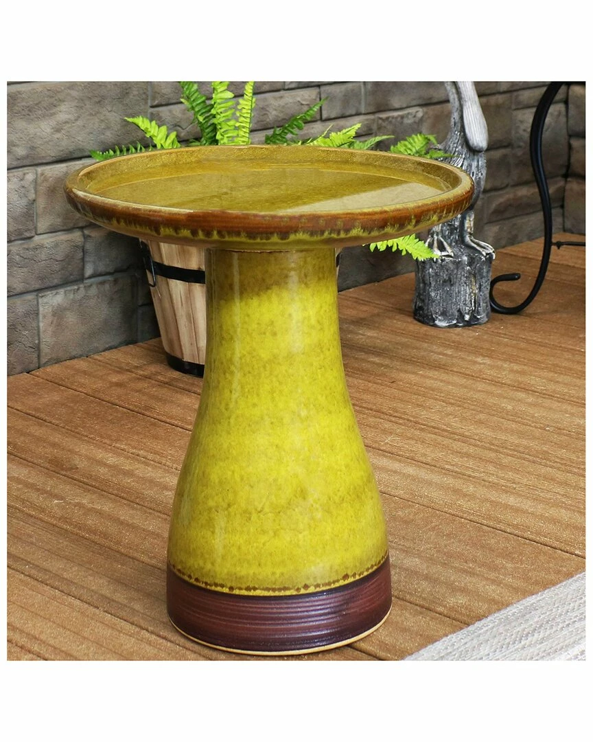 - Beckon feathered friends into the yard to play or rest in this duo tone ceramic bird bath. The outdoor bird bath features a hand-painted, glazed finish to not only enhance the functionality but to also make it easier to clean. The lovely 2-tone style is sure to add an extra accent to any yard, garden, landscape or patio.