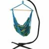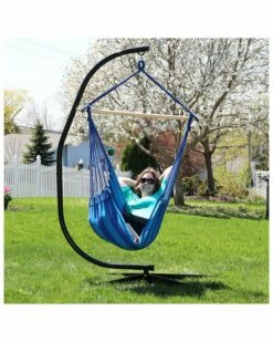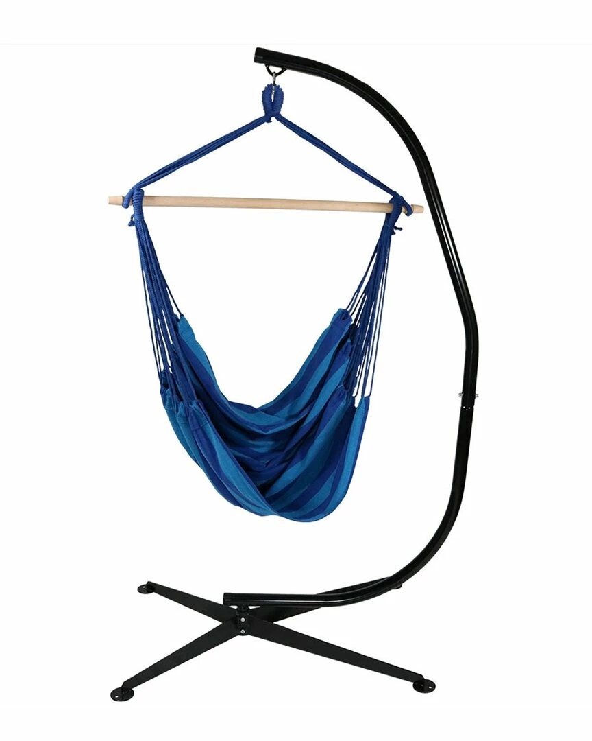 - These vibrant, large hammock chair swings will add comfort and whimsy to any outdoor space, patio, deck or yard. The chair a very roomy seat made of soft cotton material, durable polyester ropes and a sanded spreader bar for hanging. The included C stand features a durable construction. The heavy-duty stand will be just whats needed to enjoy the set to the fullest.