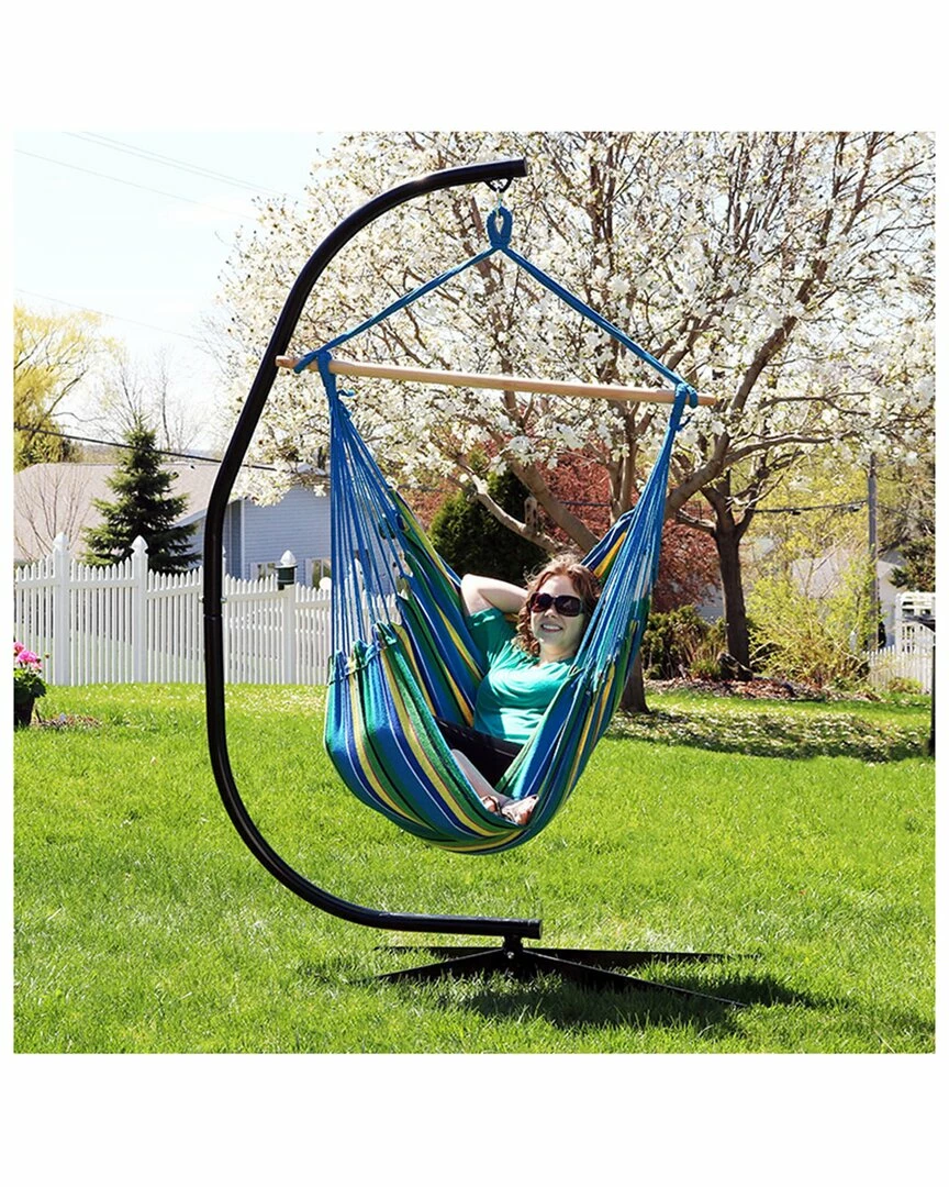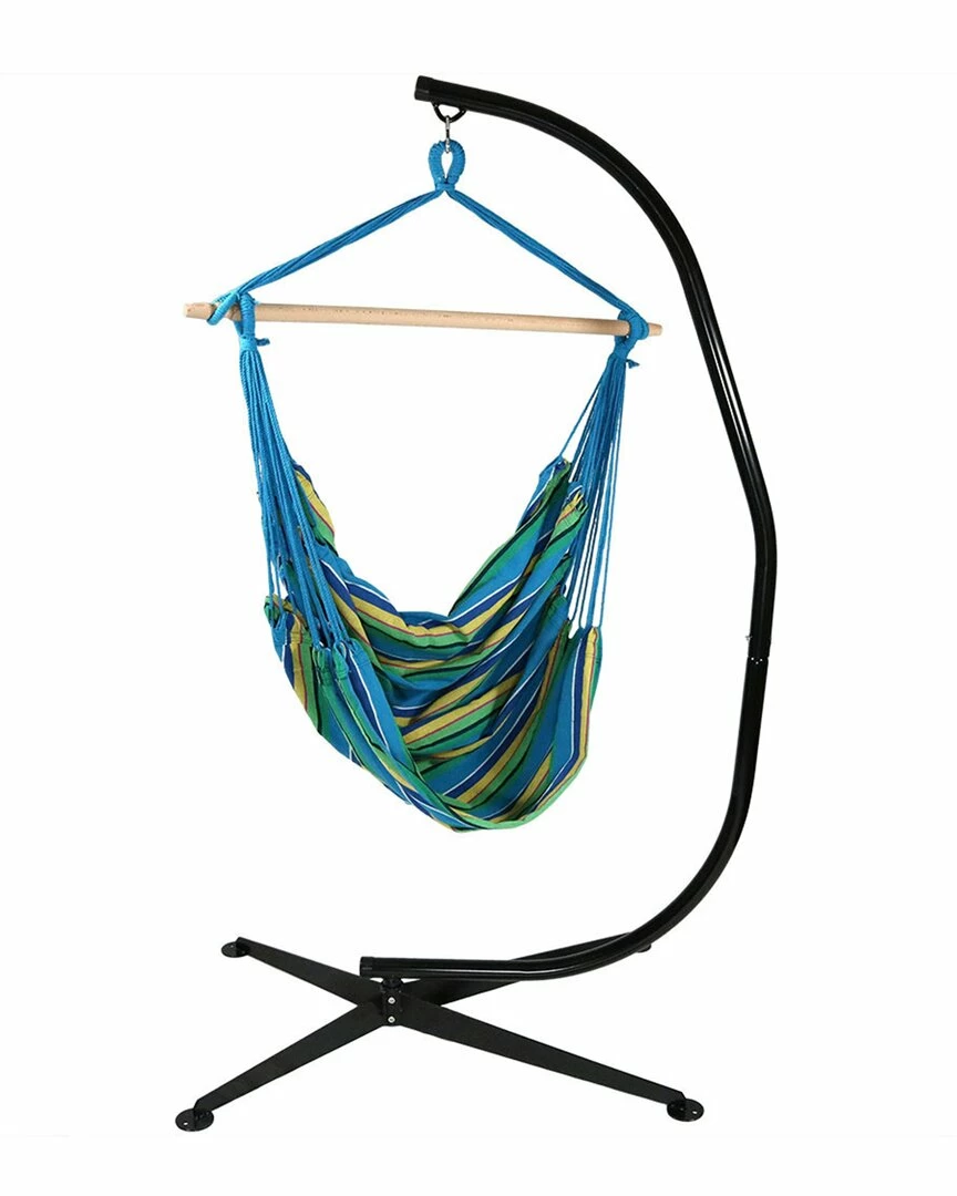 - These vibrant, large hammock chair swings will add comfort and whimsy to any outdoor space, patio, deck or yard. The chair a very roomy seat made of soft cotton material, durable polyester ropes and a sanded spreader bar for hanging. The included C stand features a durable construction. The heavy-duty stand will be just whats needed to enjoy the set to the fullest.