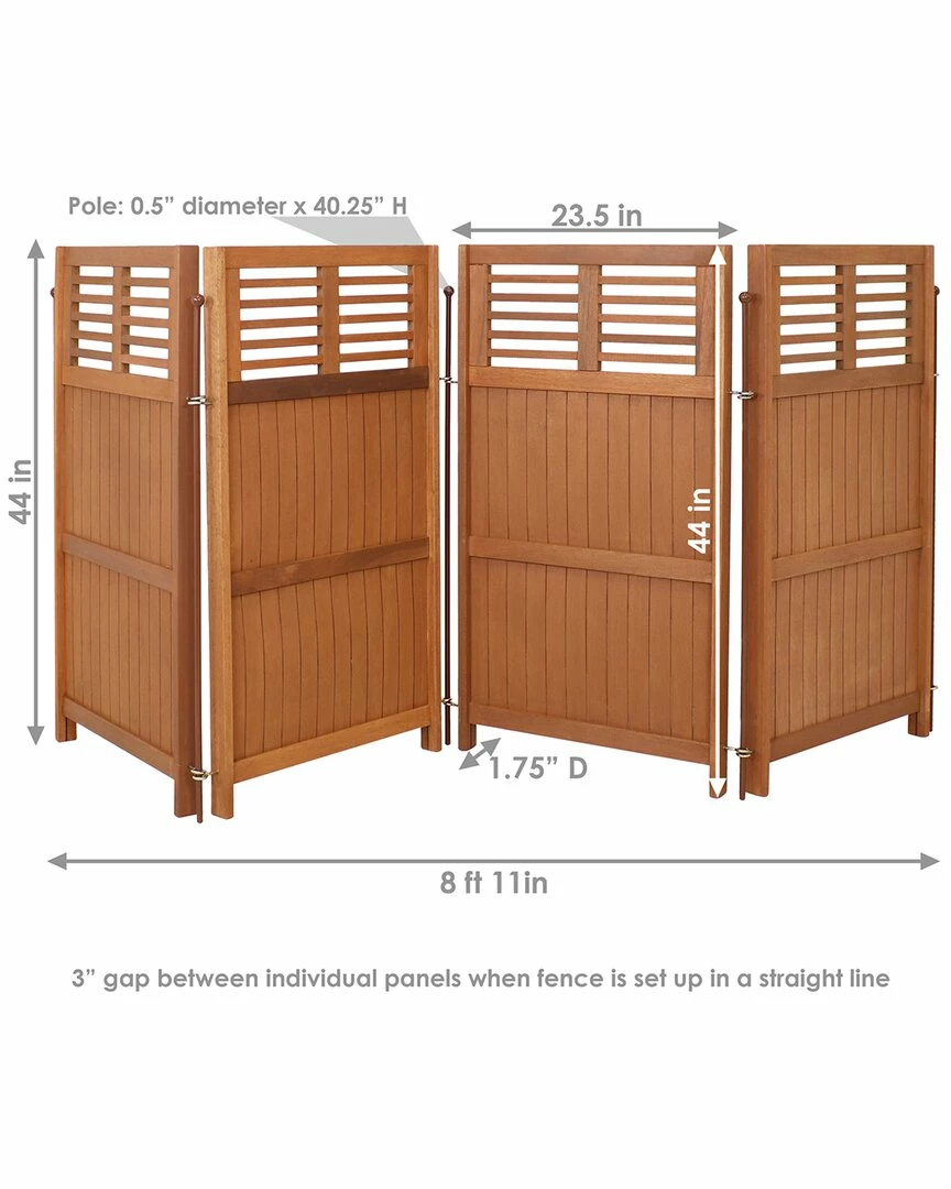 - Make your backyard more peaceful, tranquil and intimate with these outdoor folding wood panel screens. Durably constructed of meranti wood, these panels have a teak oil finish that enhances and brings out the natural beauty of the material. These versatile portable partitions are freestanding and don’t require any digging or installation to set up. They can be used to create and define spaces in the backyard or on the patio for a cozy atmosphere. Have unsightly garbage containers or utility structures? These panels provide a stylish solution for concealing these items and adding curb appeal to the exterior of your home.