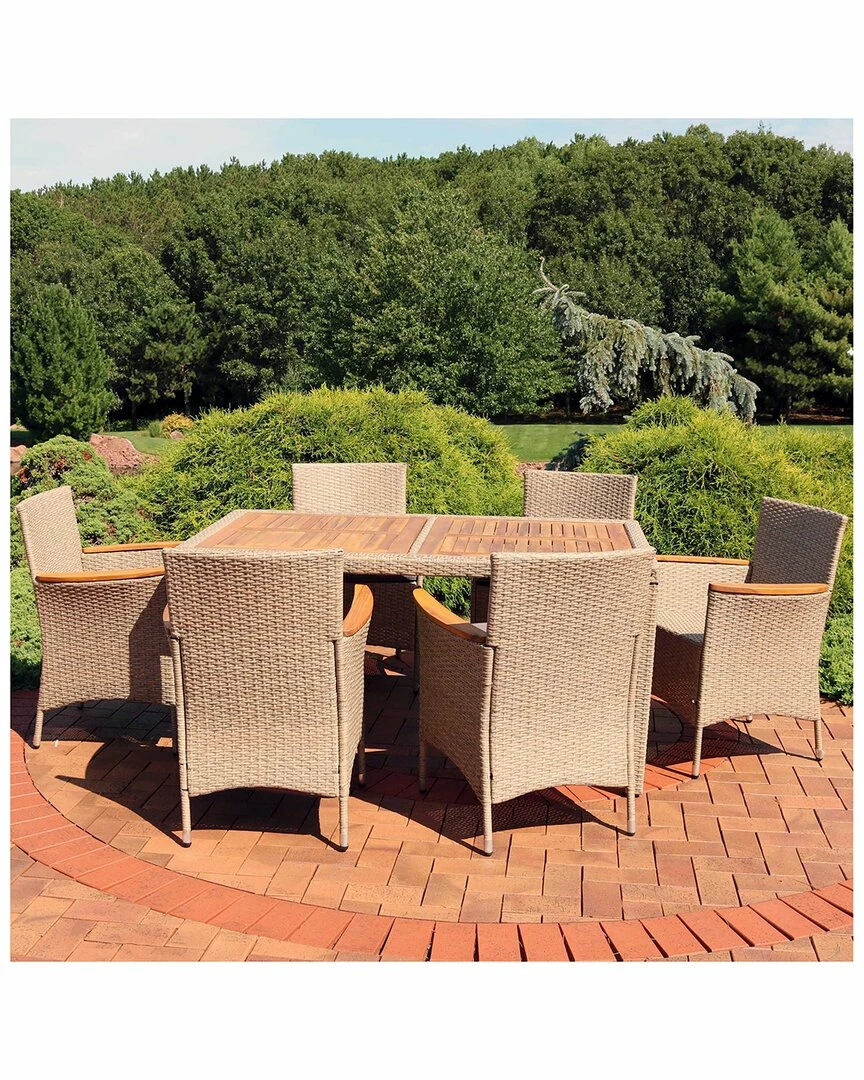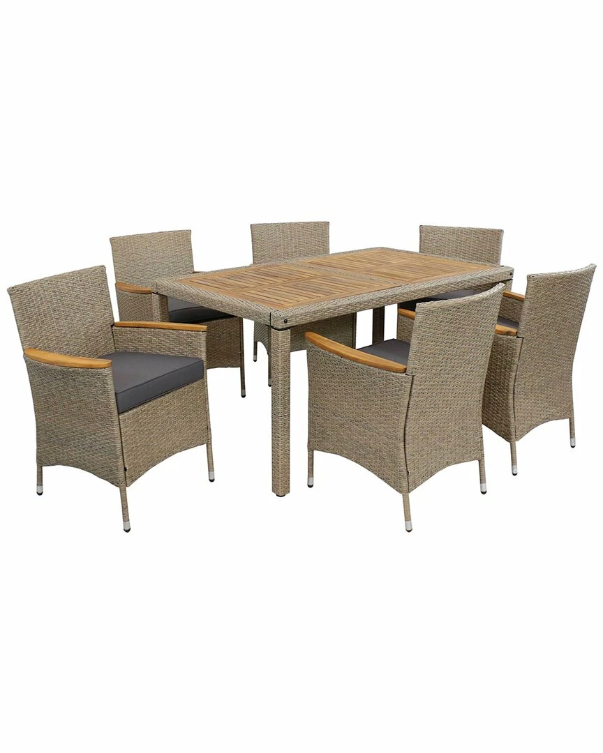 - Enjoy dinner in style on the patio with the modern Foxford 7-Piece Outdoor Dining Set from Sunnydaze Decor. This strong and durable furniture features a powder-coated steel frame that is wrapped in resin wicker rattan and accenting natural acacia wood on the arms of the chairs and tabletop. Perfect for enjoying a delicous meal and fresh air, this easy-to-assemble furniture includes all the components, hardware and tools needed to put everything together right away. Plus, this set also includes comfortable cushions for a soft place to sit down. Whether it’s enjoying pizza by the pool or enjoying an elegant meal in the backyard, this dining patio furniture will make a great addition to any outdoor living space.
