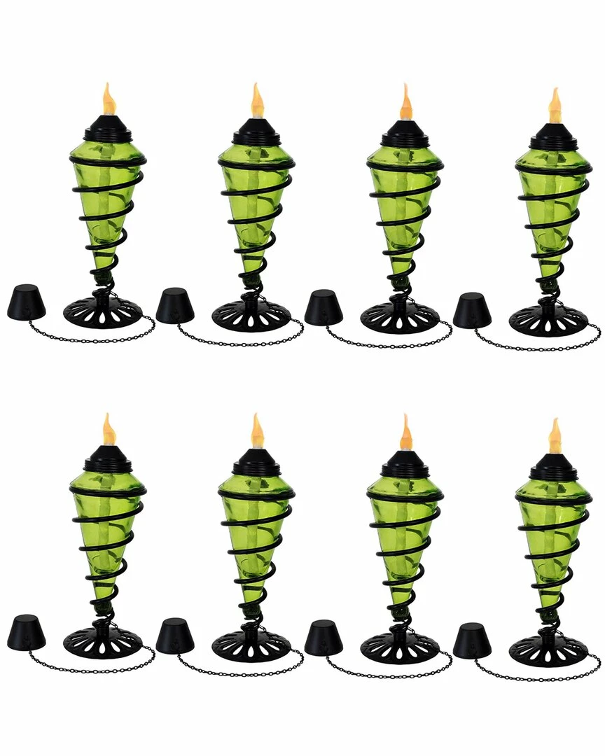 - Create a warming, decorative ambiance in any outdoor space with this set of 8 swirling glass tabletop torches by Sunnydaze Decor. Featuring vibrant coloring, these can easily add a subtle color pop to any outdoor oasis. They are a great addition to an outdoor dining space, or side tables on the patio. Each torch features an attached snuffer, so the flames can be extinguished safely and easily. Since the snuffers are tethered to the torches with a chain, there’s no need to worry about searching for or losing the snuffers. Each torch also includes a long-lasting fiberglass wick.