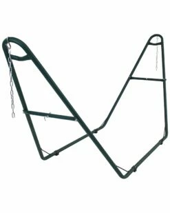 - Featuring a versatile A-frame design and ultra-durable powder-coated steel construction, this heavy-duty hammock stand is sure to be a favorite! This adjustable green stand is perfect for indoor or outdoor hammock needs! Whether its a Mayan, Brazilian, camping, or spreader bar hammock, this frame will do the trick. To fit, hammock can range from 9.5 to 14′ long. The metal stand features a sturdy 1.5″ powder-coated steel tube frame for resistance to rust, as well as adjustable chains and s-hooks, making this movable double stand perfect for any hammocks.