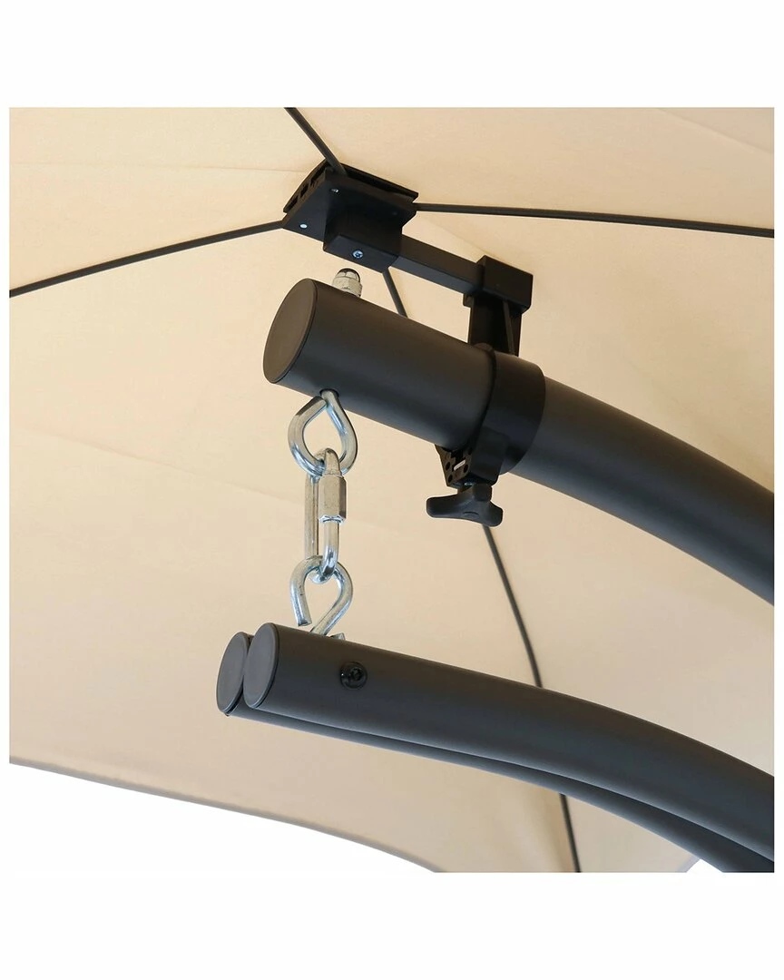 - This hanging chaise lounge chair with base will provide comfortable seat ing wherever it’s placed. With the removable canopy umbrella, there are no worries about being uncomfortable in the sunshine. Also, the large, vibrantly-colored polyester pad easily ties on to the frame while the black padded armrests provide a comfortable place to rest arms or grab onto.