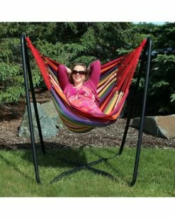 - Add fun and comfort to any outdoor space, patio, deck or yard with this 2-point hanging space-saving hammock chair swing and stand set. Because of the unique, durable “A” stand design and 2-point hanging chair, this has a very roomy seat when compared to other hammock chairs, made of soft cotton material with durable ropes and points for 2-sided hanging. The included “A” stand features a durable tubular steel construction. The heavy-duty stand features a unique double “A” frame secures the hammock swing on both hanging points. Plus, the 40″ x 40″ base makes it easy to put up in smaller spaces.