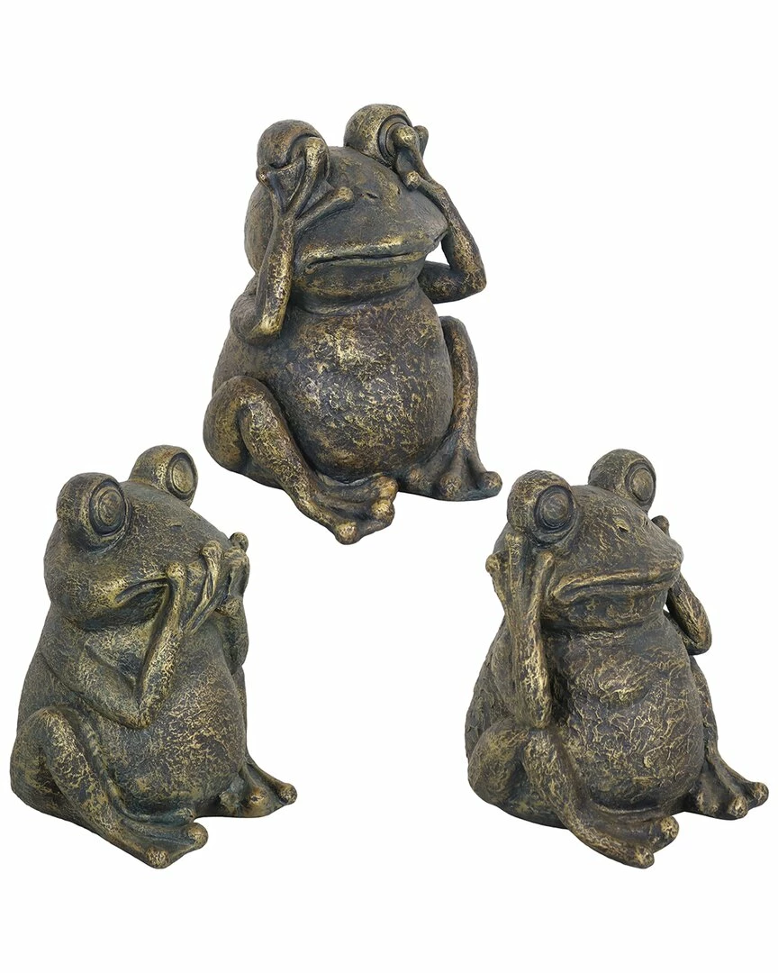 - Add character to the patio, garden or indoor living spaces with this trio of 3 frogs. The 3 wise frogs are posed in classic hear no evil, see no evil and speak no evil stances and are the perfect accent pieces to the home or garden. They feature a polystone construction that is made from polyresin mixed with stone powder for a stone-like texture that is lightweight and easy to maintain. The statues are painted with an antique finish.