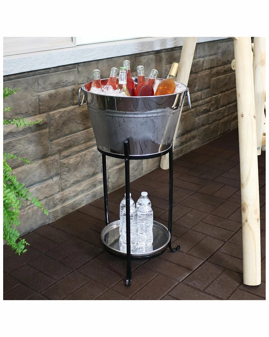 - This stainless steel drink bucket with tray and stand by Sunnydaze Decor makes it easy to add form and function to indoor or outdoor gatherings. The approximately 5-gallon tub is large enough to accommodate ice and several bottles and/or cans of wine, beer, soda, juice, or water. The tub features high-quality welded seams, and an extra-durable, stainless steel construction. The 16-millimeter iron stand is engineered to last and not wobble, so drinks can be stowed away with confidence. Plus, the set can be assembled in less than 10 minutes because all the parts and tools are included. Simply assemble the stand and place the ice bucket on top and serving tray on the lower tier.