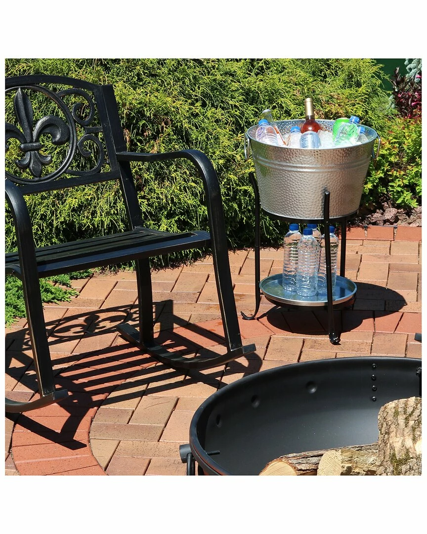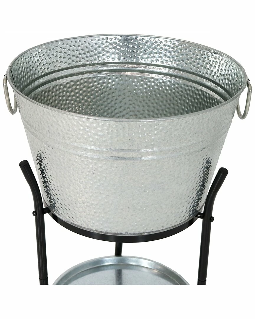- Serve drinks in style with the Sunnydaze Ice Bucket Drink Cooler with Stand and Tray. The approximately 5-gallon tub is large enough to accommodate ice and several bottles and/or cans of wine, beer, soda, juice, or water. The tub features high-quality welded seams, and an extra-durable, galvanized steel design with a charming pebbled pattern. The 16-millimeter iron stand is engineered to last and not wobble, so drinks can be stowed away with confidence. Plus, the set can be assembled in less than 10 minutes because all the parts and tools are included. Simply assemble the stand and place the ice bucket on top and serving tray on the lower tier.