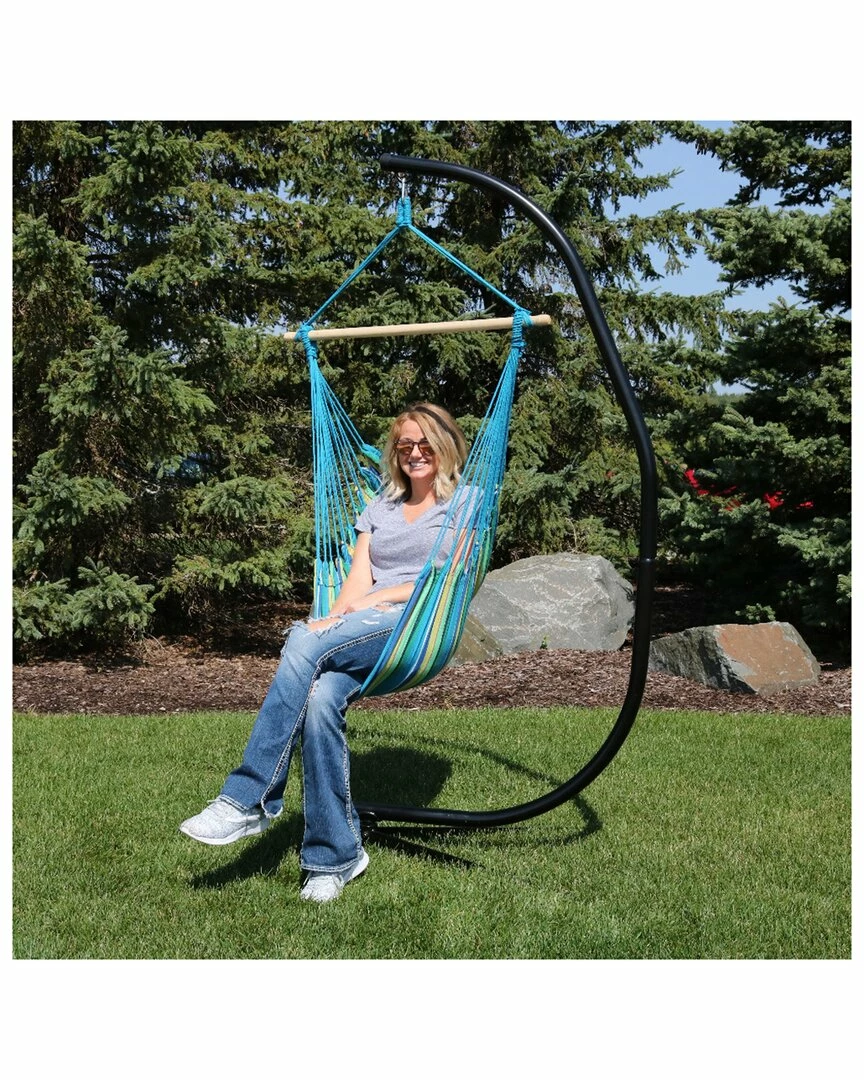 - Sink into relaxation with this hammock chair and C-Stand. The vibrant blue, yellow and green striped cushions add comfort and style while the chair itself adds a bit of whimsy. The included C-Stand features a durable construction. The heavy-duty stand will be what is needed to relax and enjoy the set to the fullest.