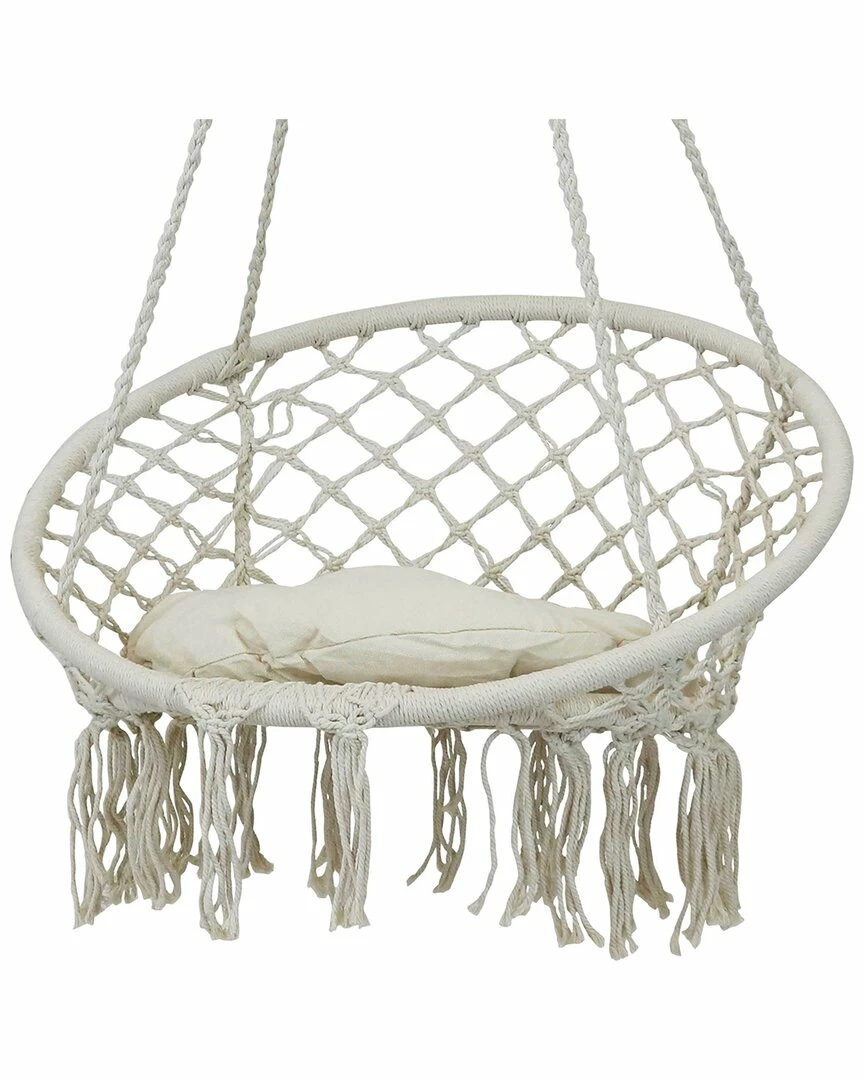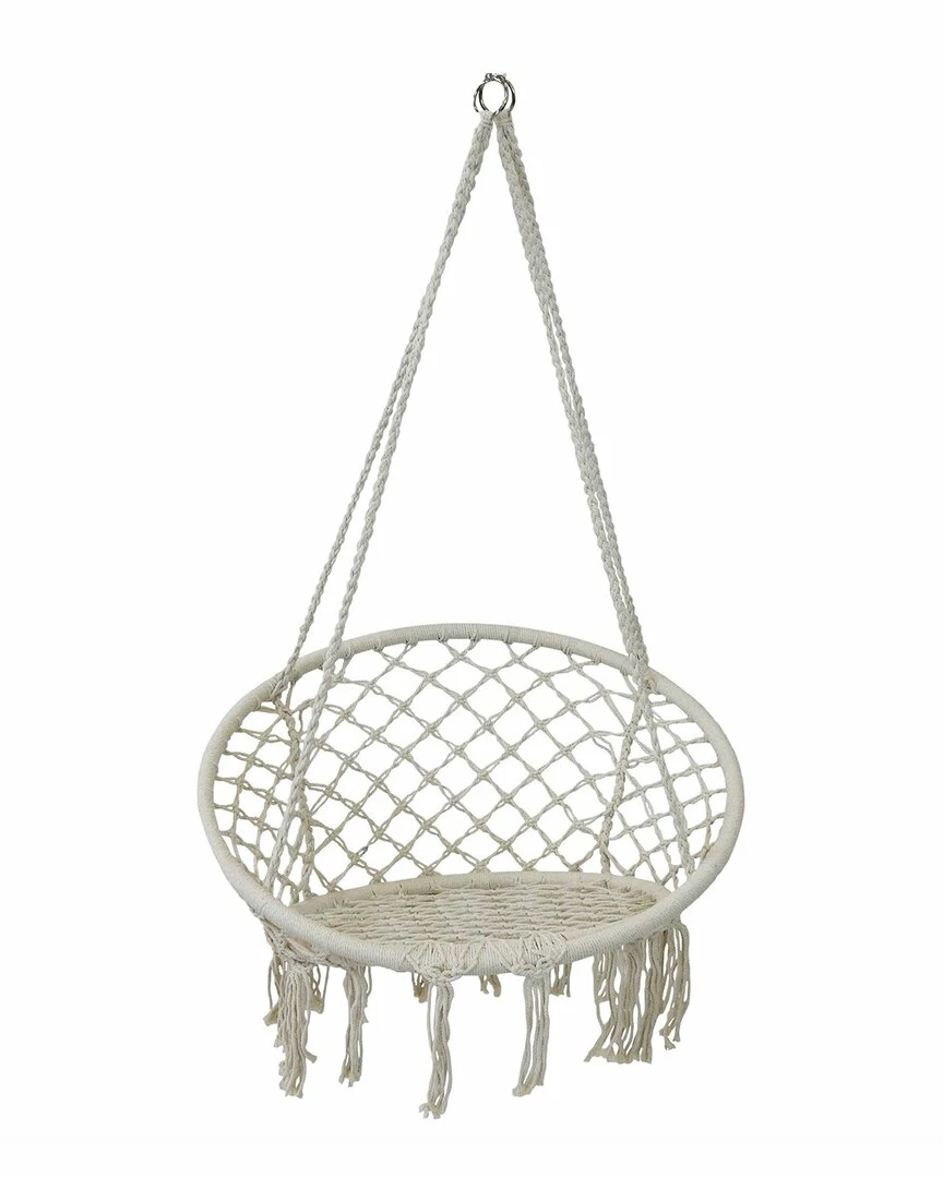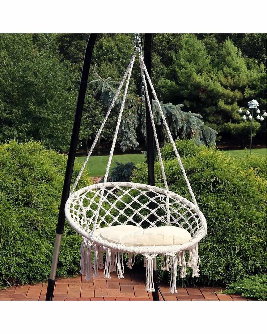 - Add whimsical, eclectic, Bohemian charm to any indoor or outdoor living space with this Macrame Hanging Hammock Chair by Sunnydaze Decor. Hang it in the bedroom, living room, sun room, on the deck, patio or porch. Each chair comes fully equipped with a cushion and ceiling mount hardware for wood rafters/beams or concrete ceilings. The chair features cotton rope wrapped around a powder-coated steel frame with zinc-coated hanging rings and a cotton/poly blend cushion. The hardware kit includes 1 ceiling bracket, 4 concrete bolts, 4 nuts, 4 washers, 4 concrete anchors, 4 wood bolts (for mounting to wood beams/rafters), a 5-foot x 0.5-inch chain, and 3 carabiners to safely hang the chair from a wood rafter or cement ceiling.